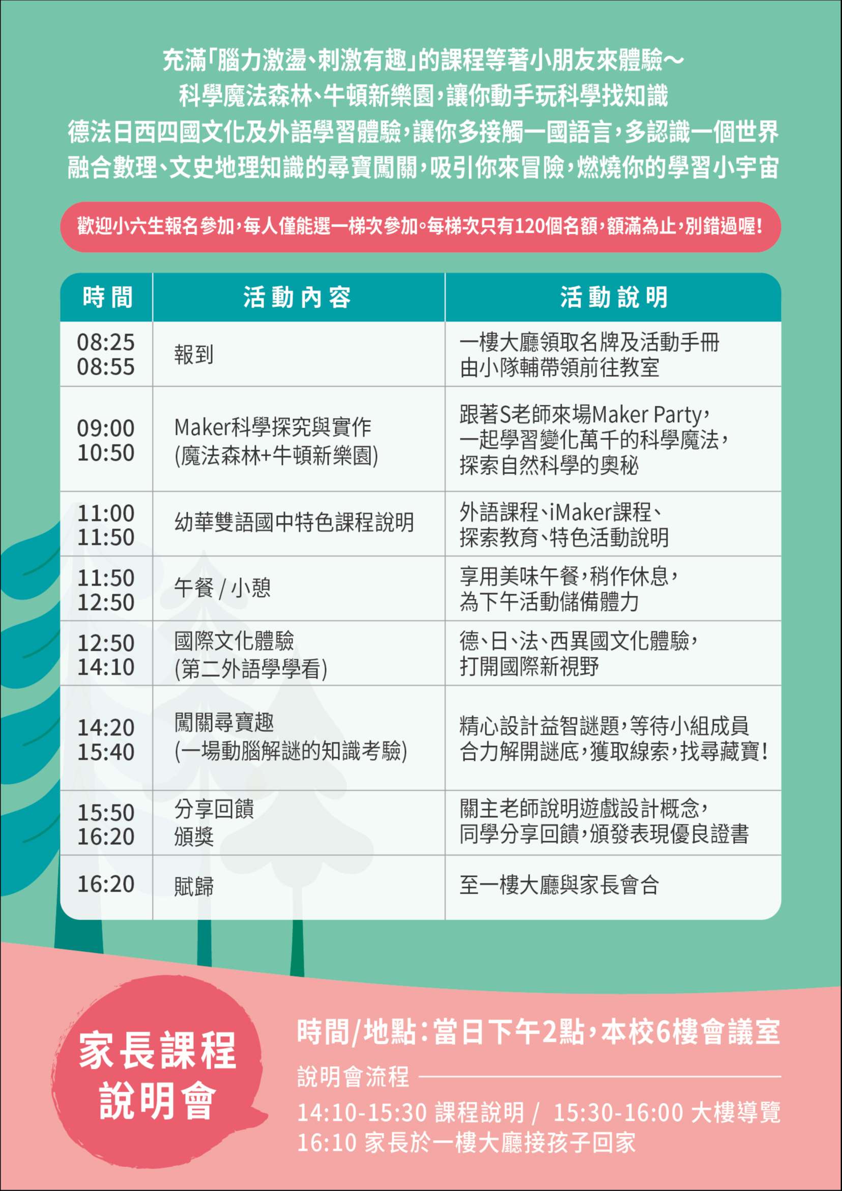 二、活動地點:臺北市幼華雙語國中(臺北市北投區北投路二段55號,北投捷運站旁)。
