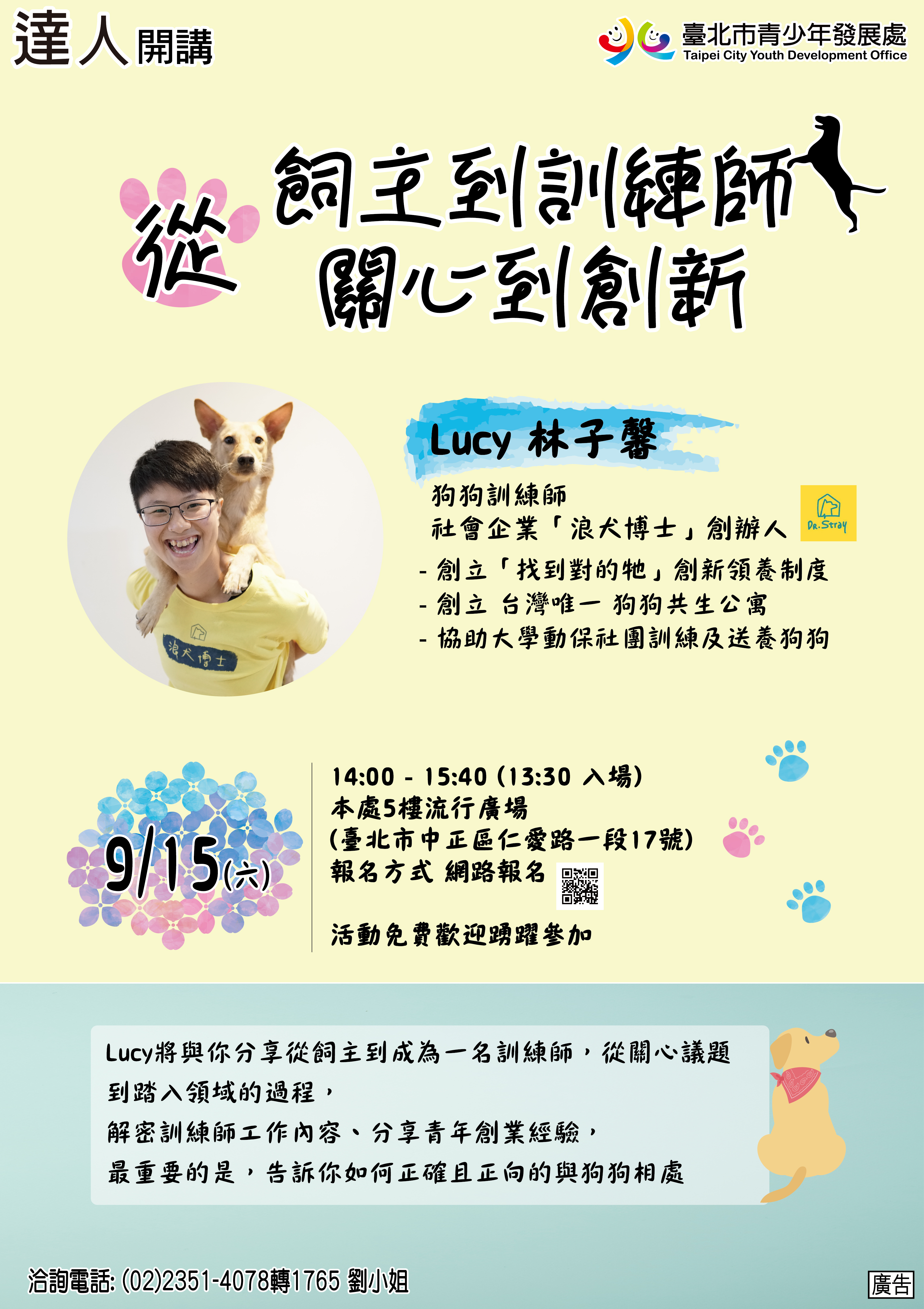 說明:旨案活動特邀社會企業浪犬博士創辦人Lucy,解密訓練師工作內容、分享青年創業經驗,告訴你如何正確與狗相處。惠請貴單位自即日起至107年9月15日止,協助於網頁、跑馬燈等所屬管道廣為宣傳,並轉知相關社團,鼓勵學員參與。