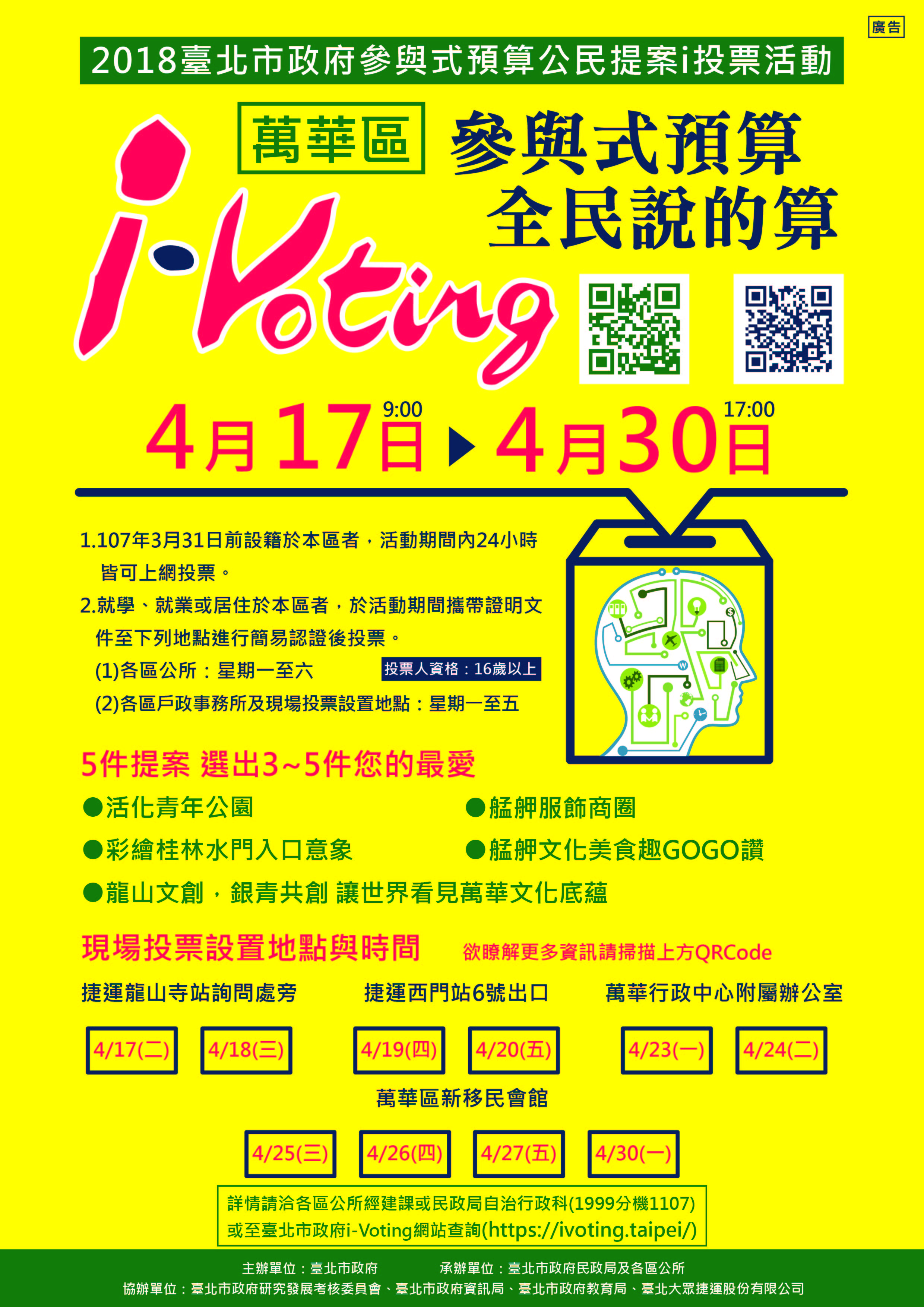 二、投票相關資訊將配合投票期間公告於本案投票網站(https://ivoting.taipei/74-survey-intro),投票期間為107年4月17日上午9時至107年4月30日下午5時止,投票方式為網路投票及現場投票(投票資格為年滿16歲,設籍、居住、就業或就學於萬華區),投票並可參加抽獎。