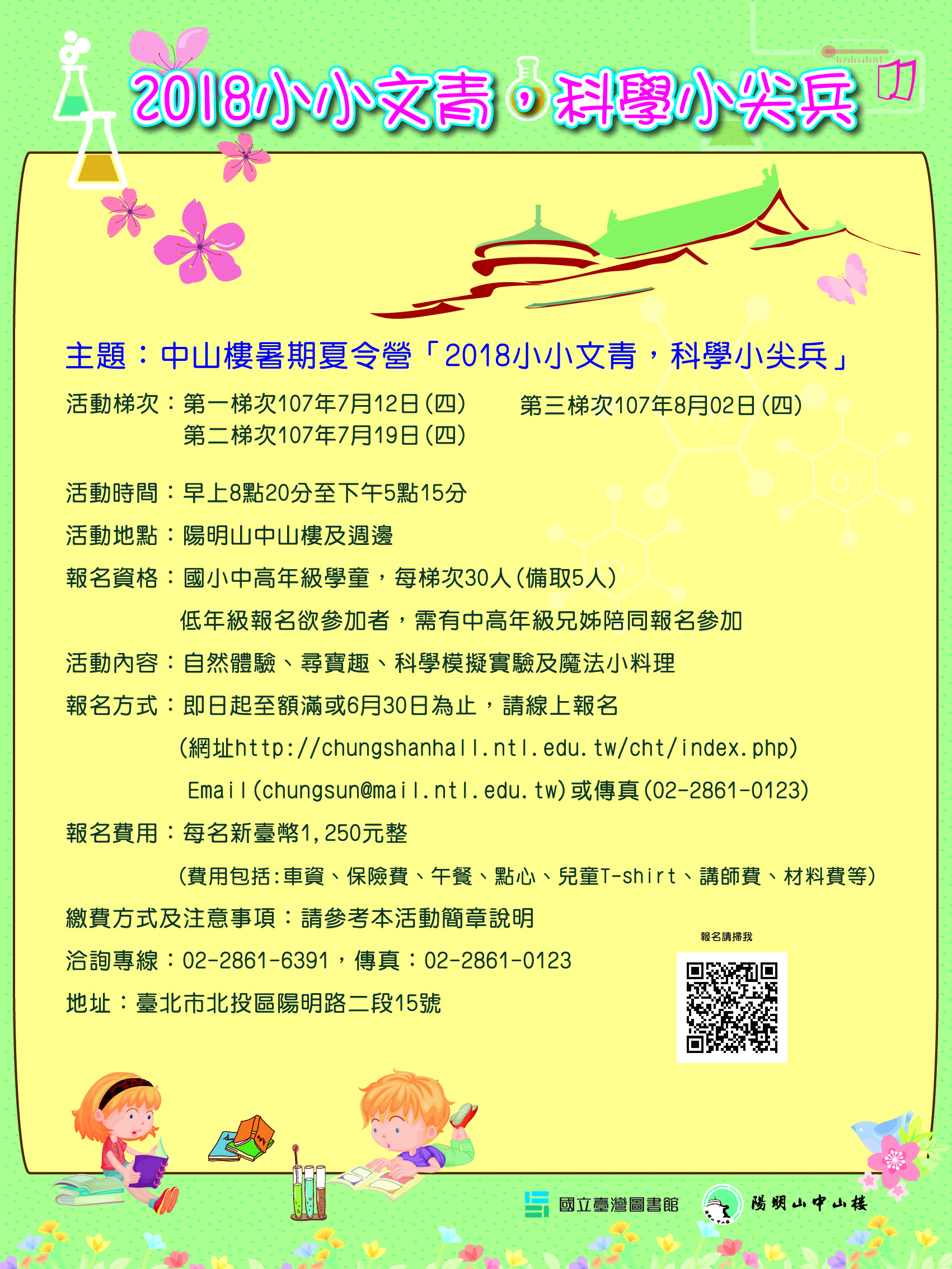 一、本館為配合教育部鼓勵學生於暑假期間發揮「暑期增能、做中學習」精神,特辦理此活動,以增進年輕學子對中山樓特有之人文歷史、生態環境與建築藝術有更深一層的認識。因中山樓是世界唯一建築在硫磺坑口上的建築物,爰於本次活動設計火山相關科學實驗課程,希冀國小學童能在自然場域中,學習成為一位科學小尖兵,以達到寓教於樂及陶冶身心之目的。
