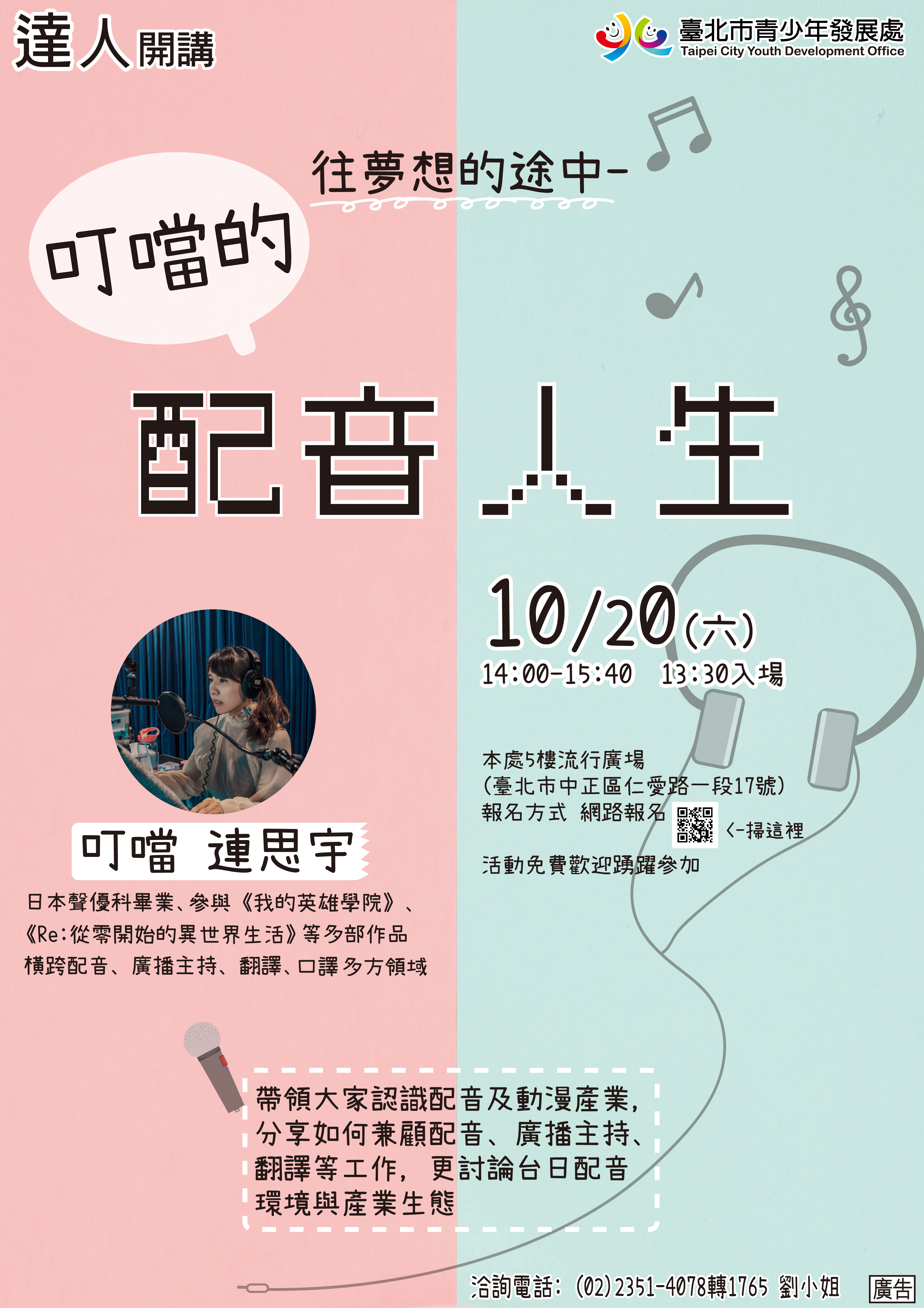 二、宣傳稿如下,請參酌使用:臺北市青少年發展處10月20日舉辦達人開講「叮噹的配音人生」,邀請日本聲優科畢業配音員叮噹-連思宇,帶領大家認識配音及動漫產業,分享如何兼顧配音、廣播主持、翻譯等工作。活動免費詳官網。