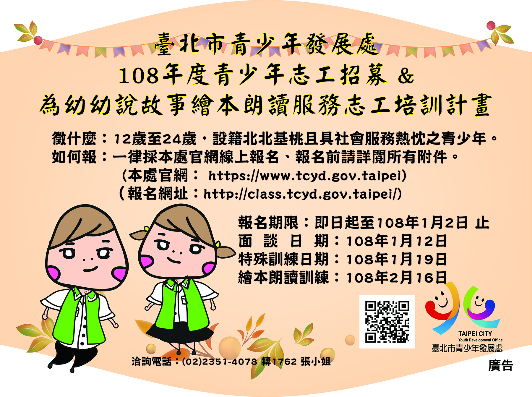 二、招募對象:12歲至24歲設籍臺北市或就讀臺北市、新北市、基隆市、桃園市公私立國民中學以上各級學校(含自學生)且具社會服務熱忱之青少年。