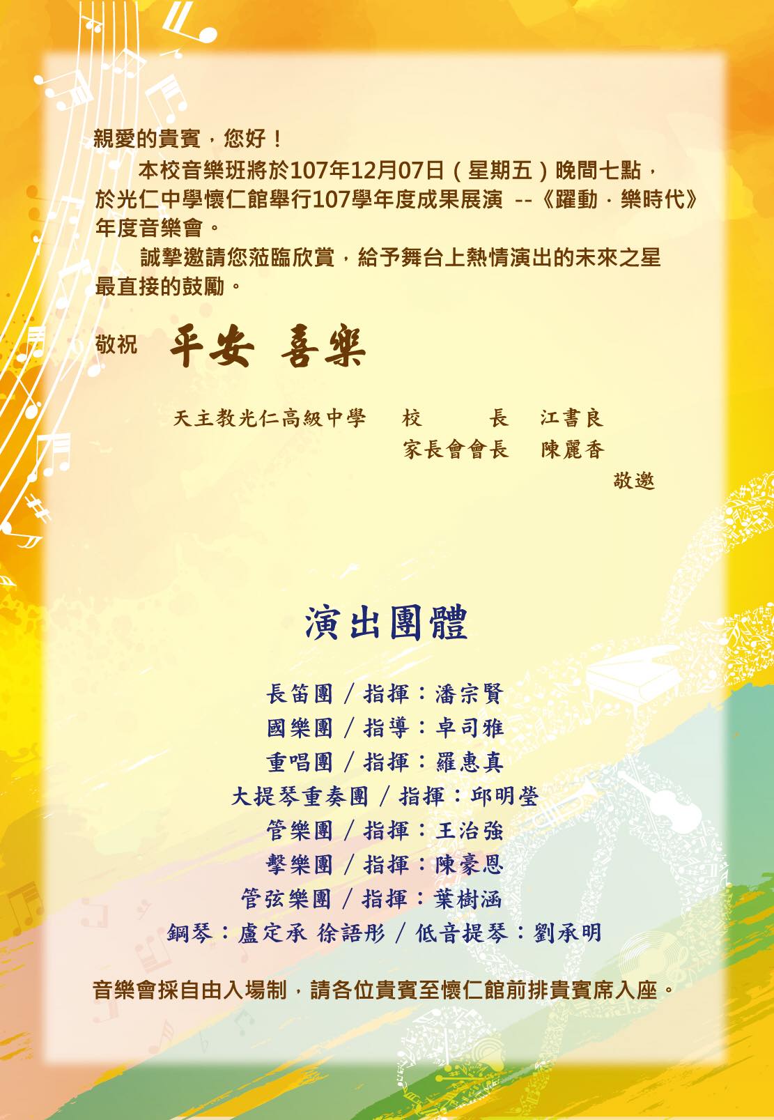 三、本音樂會採自由入座,晚間6:30起開放觀眾席進場。