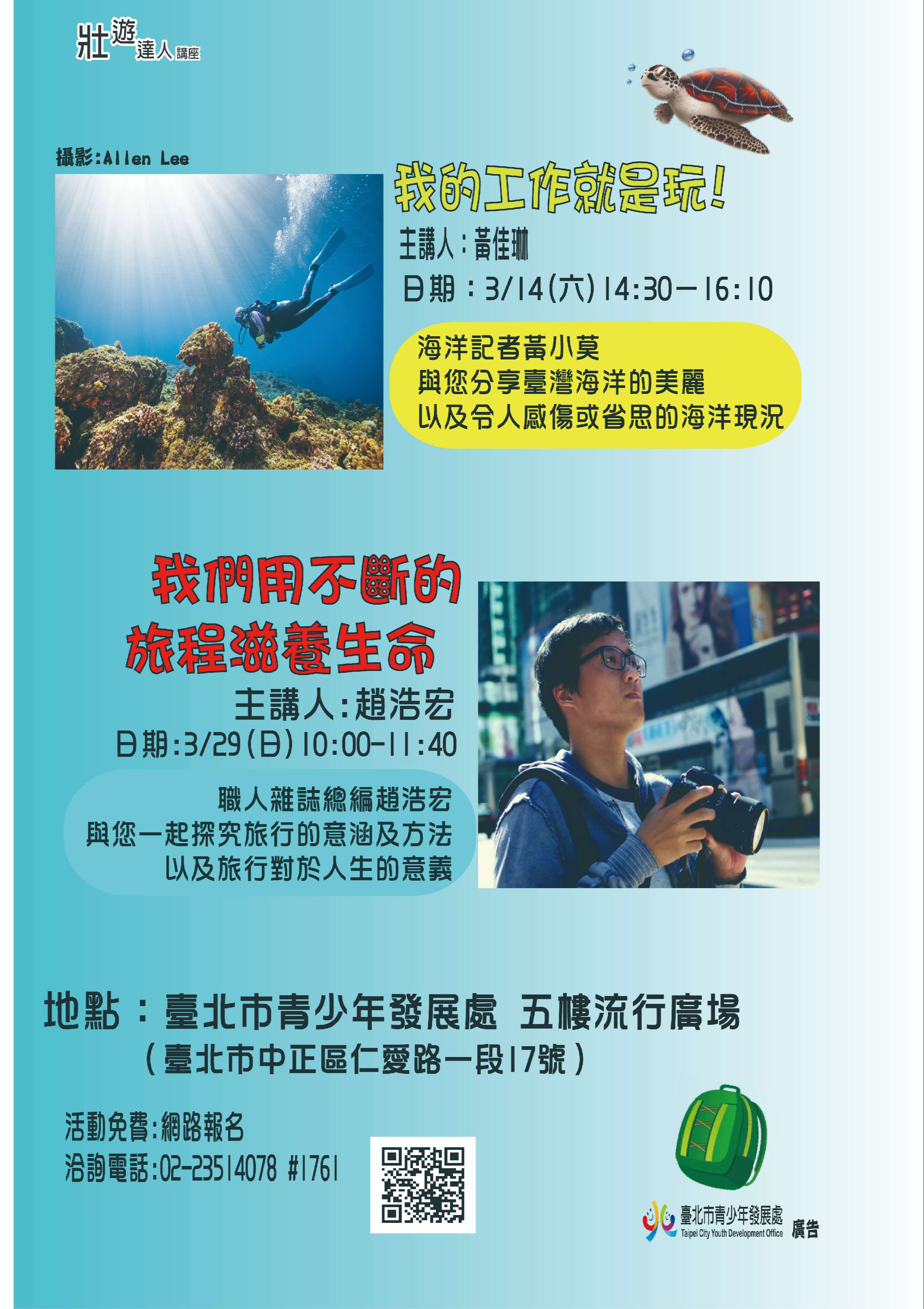 一、本活動目的為經由講師壯遊經驗分享,讓年輕學子認識到壯遊的意義,進而了解自身,找到未來的道路與建立自我價值;此次講座邀請黃佳琳及趙浩宏擔任講師,分享壯遊經歷對其人生的影響。