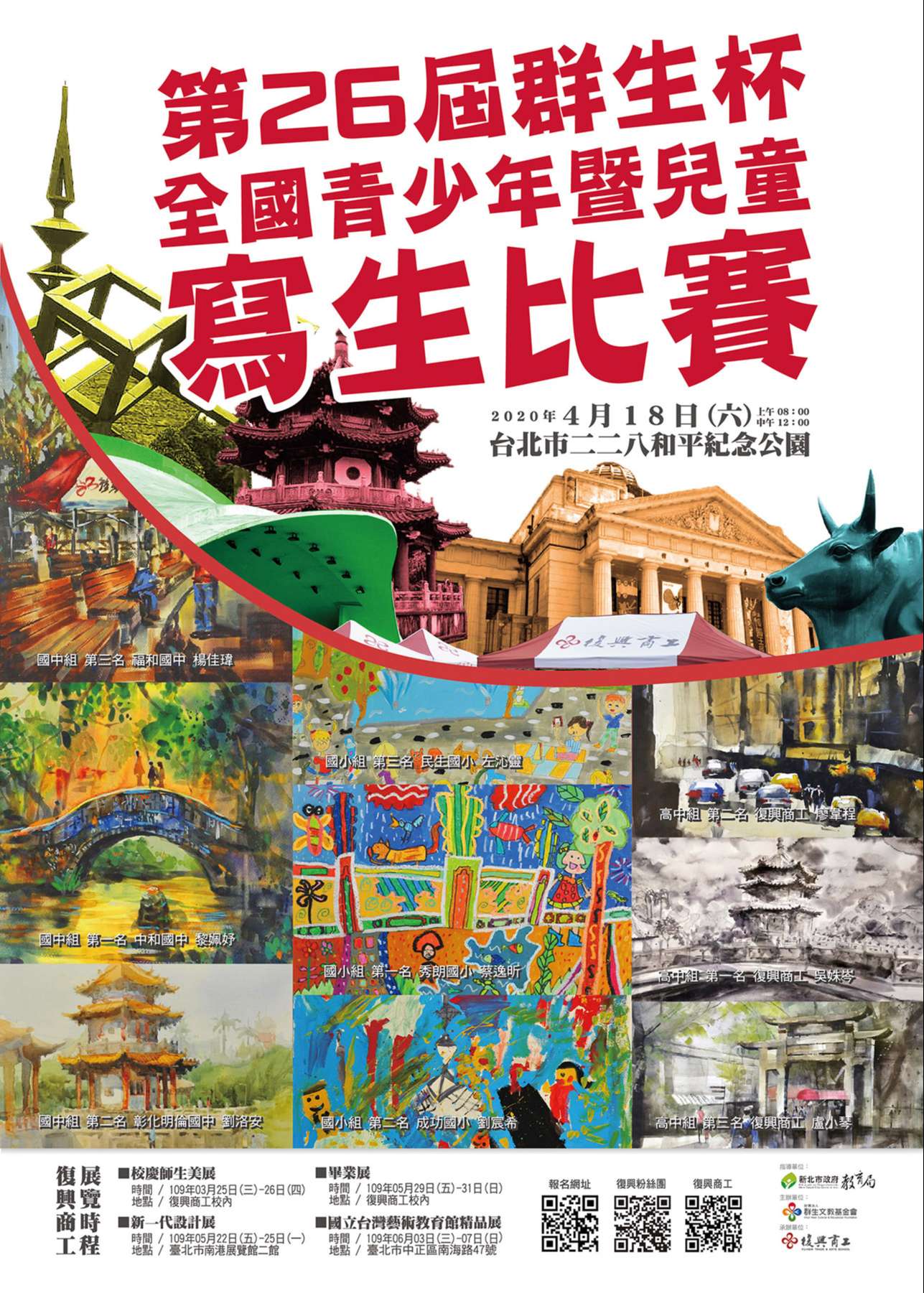 三、比賽方式:採現場寫生方式,題材以二二八和平公園建築及庭園景觀為主,比賽用四開畫紙由本會提供,用具一律自備,採用任何描繪工具、材料皆可,表現形式不拘,並不得自備紙張或由他人代筆、修改,違者取消資格。