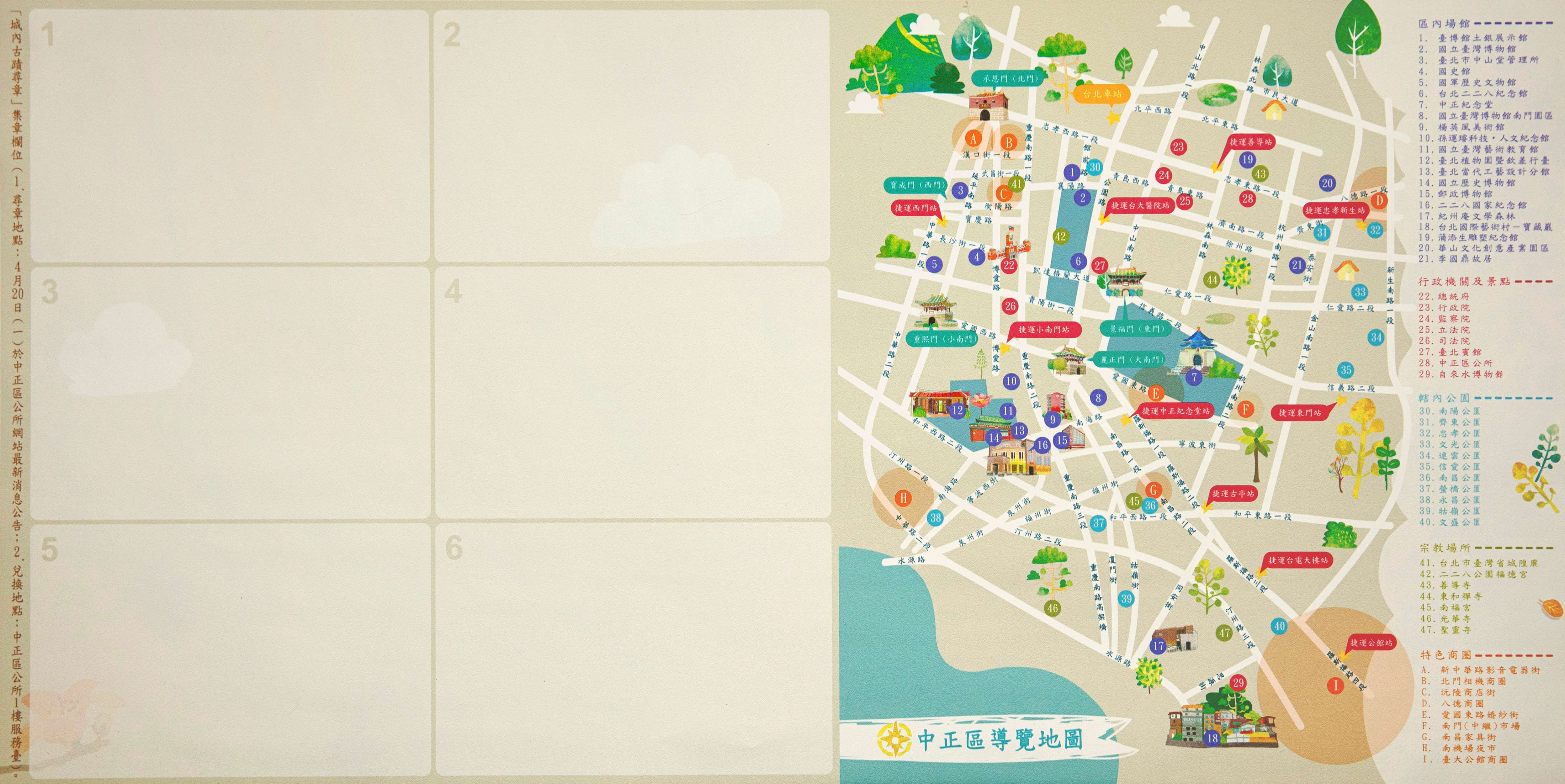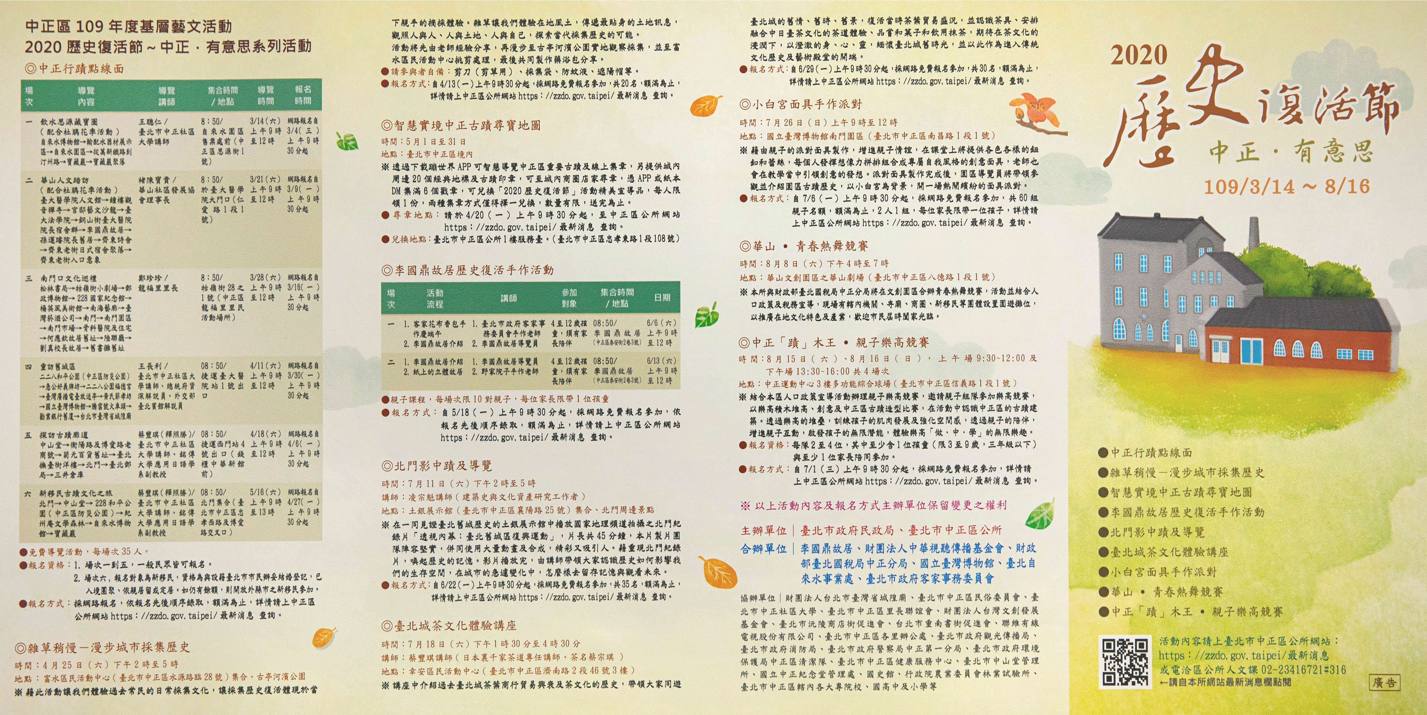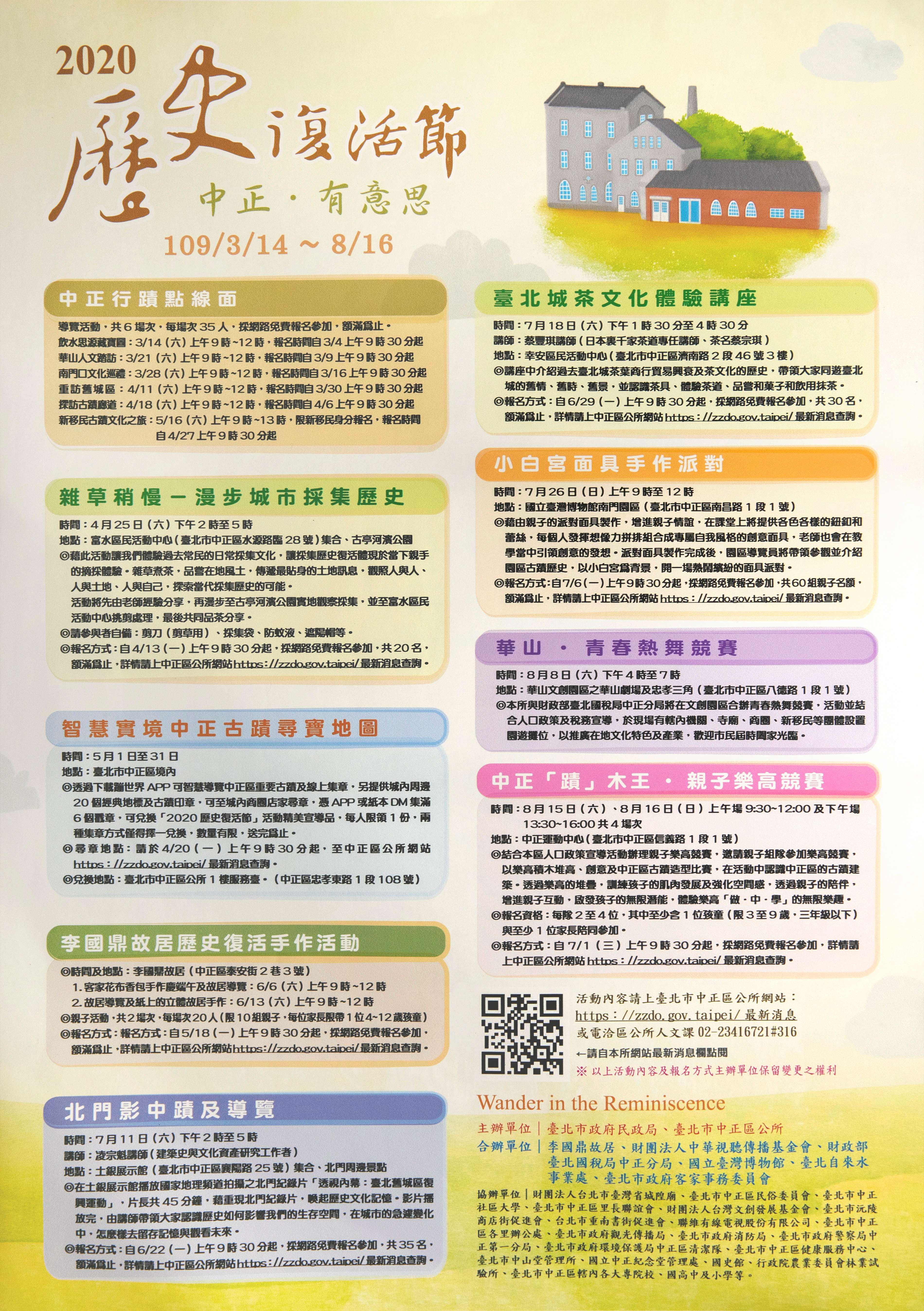 二、「2020歷史復活節~中正.有意思」系列活動,於109年3月14日至8月16日辦理,活動包含「中正行蹟點線面」、「雜草稍慢-漫步城市採集歷史」、「智慧實境中正古蹟尋寶地圖」、「李國鼎故居歷史復活親子手作」、「北門影中蹟及導覽」、「臺北城茶文化體驗講座」、「小白宮面具手作派對」、「華山.青春熱舞競賽」及「中正『蹟』木王.親子樂高競賽」等9項活動,邀您一同嬉遊中正,體驗古蹟歷史人文之美!詳情請上中正區公所網站(https://zzdo.gov.taipei/最新消息)查詢,或電洽02-23416721分機316。