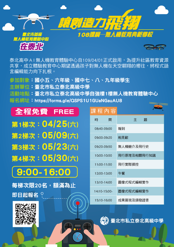 三、AI無人機學生體驗營隊:共計辦理4梯次:109年4月25日、5月9日、5月23日、5月30日 (9:00-16:00,六小時),每梯次20名。參加學生對象為國小五、六年級及國中七、八、九年級學生。學生體驗營報名,採線上報名,詳細實施計畫,請參閱附件及海報。