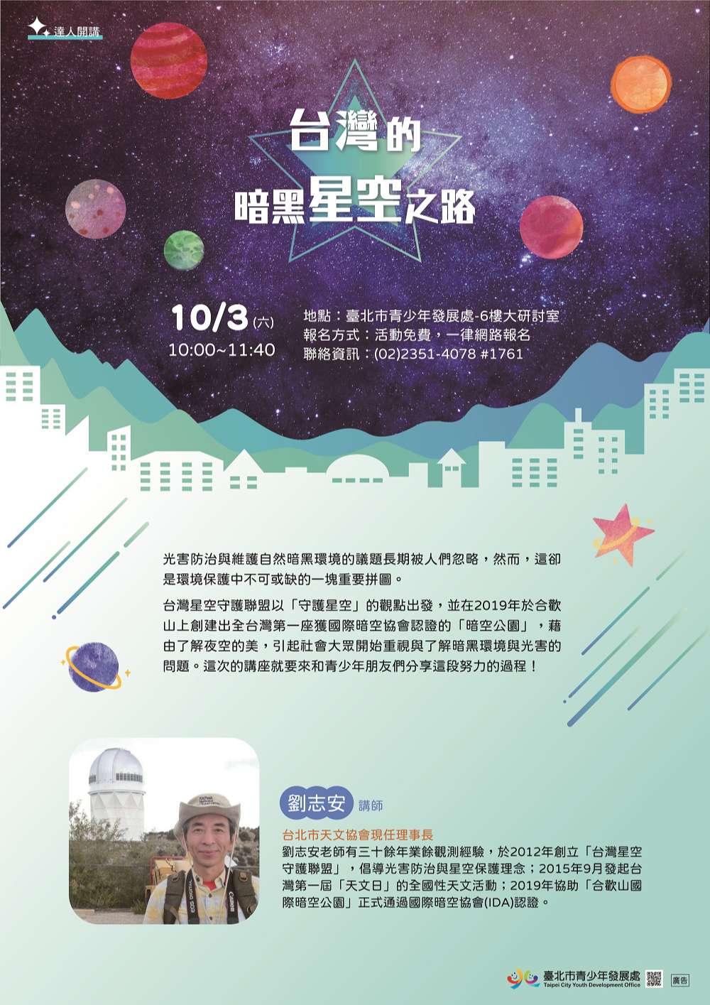 一、本活動目的為經由講師職涯經驗分享,讓年輕學子認識各行各業,藉以了解自身興趣及性向,進而找到未來的道路與建立自我價值;此次講座邀請台北市天文協會理事長劉志安擔任講師,分享創建出全台灣第一座獲國際暗空協會認證的「暗空公園」的努力過程!