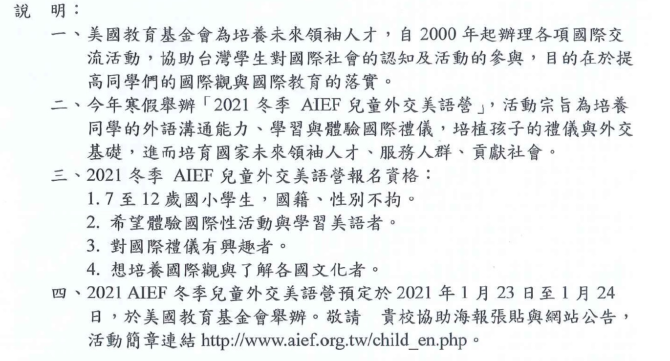 美國教育基金會駐華辦事處「2021冬季AIEF兒童外交美語營」活動