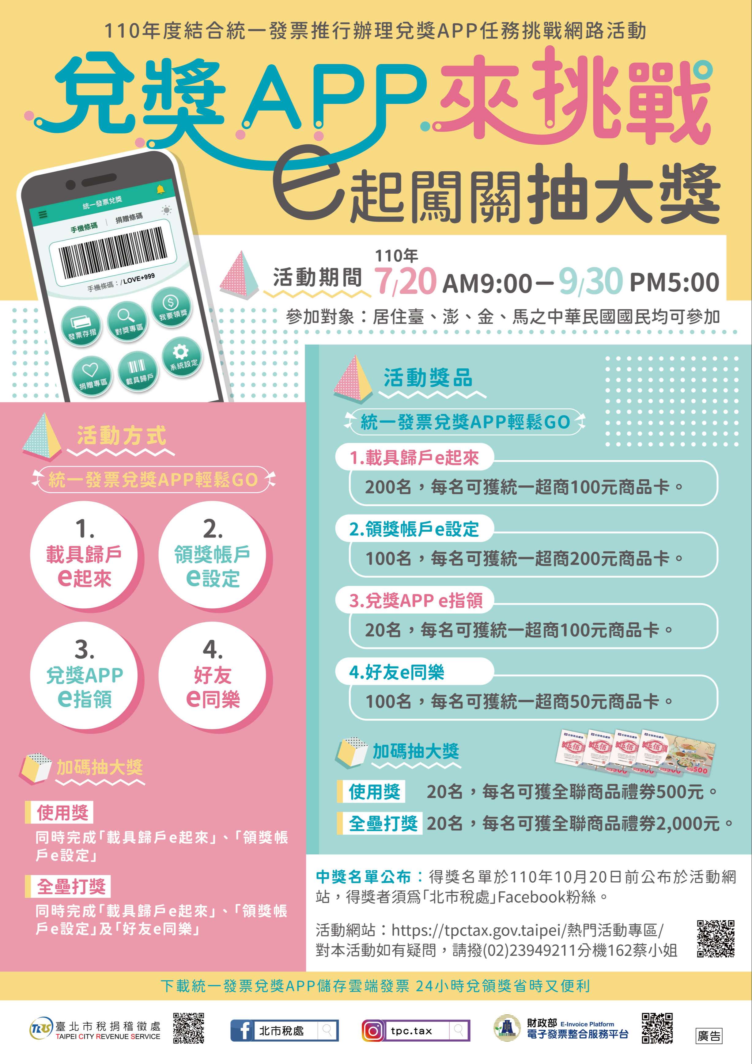 (二)活動內容:只要完成「統一發票兌獎APP輕鬆GO」項目,包括「載具歸戶e起來」、「領獎帳戶e設定」、「兌獎APP e指領」及「好友e同樂」等4個任務任一項,並成為「北市稅處」粉絲,可抽統一超商商品卡。若同時完成多項任務,加碼抽全聯商品禮券。