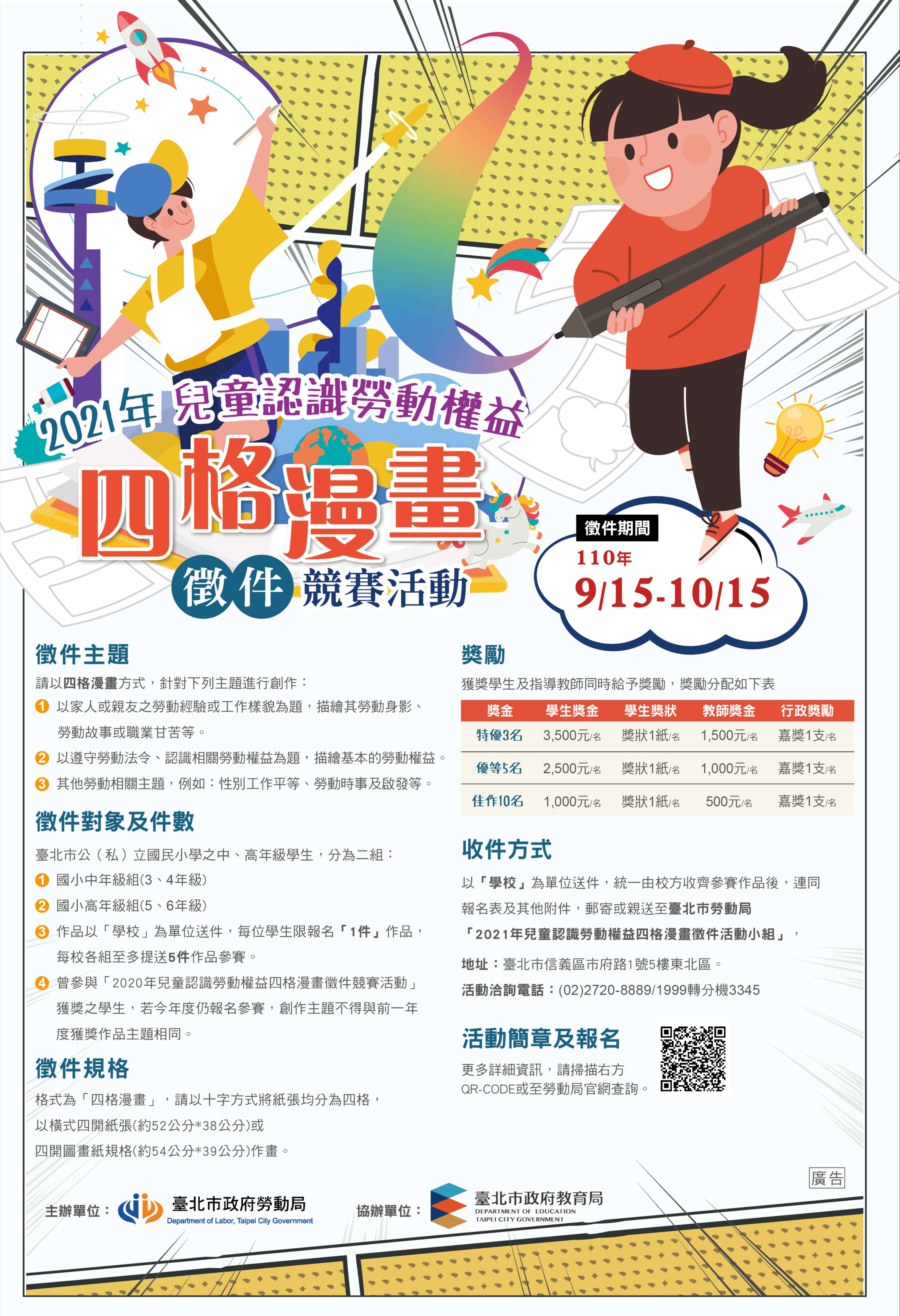 二、為推廣校園勞動教育再向下扎根,以本市國民小學中、高年級學生為對象,辦理「2021年兒童認識勞動權益四格漫畫徵件競賽活動」,期藉由競賽式活動設計,鼓勵教師將勞動教育融入繪畫教學,並指導學生參加四格漫畫創作,進而啟發學生對勞動尊嚴及職場環境之認知與關心,以提升未來公民勞動素養(活動徵件訊息本府教育局前以110年6月2日北市教國字第1103052243號函轉知貴校在案),先予敘明。