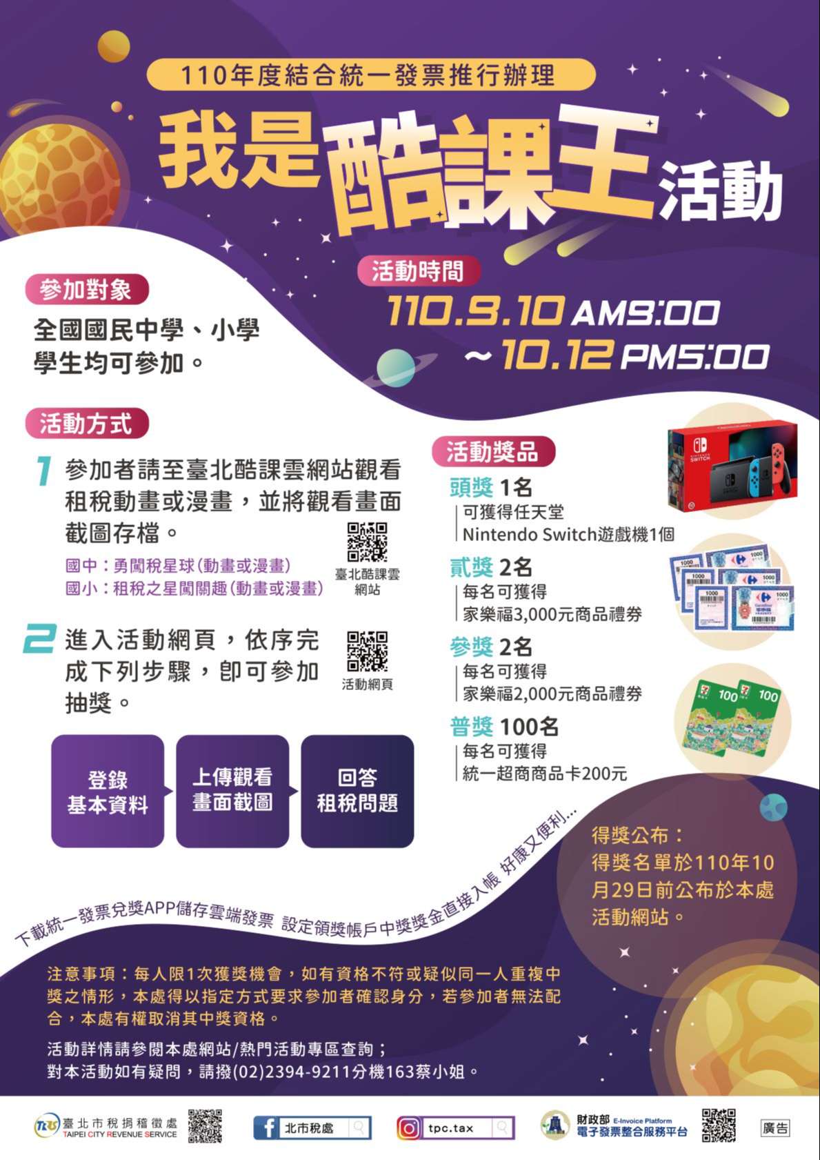 三、活動內容:全國國中、國小學生於活動期間至臺北酷課雲網站之臺北市金融理財教育─租稅教育專區內觀看租稅教育漫畫或動畫等任務,並至稅捐處活動網頁完成租稅問題,就有機會獲得Nintendo Switch、家樂福禮券或統一超商商品卡等好禮,獎項多達105個。
