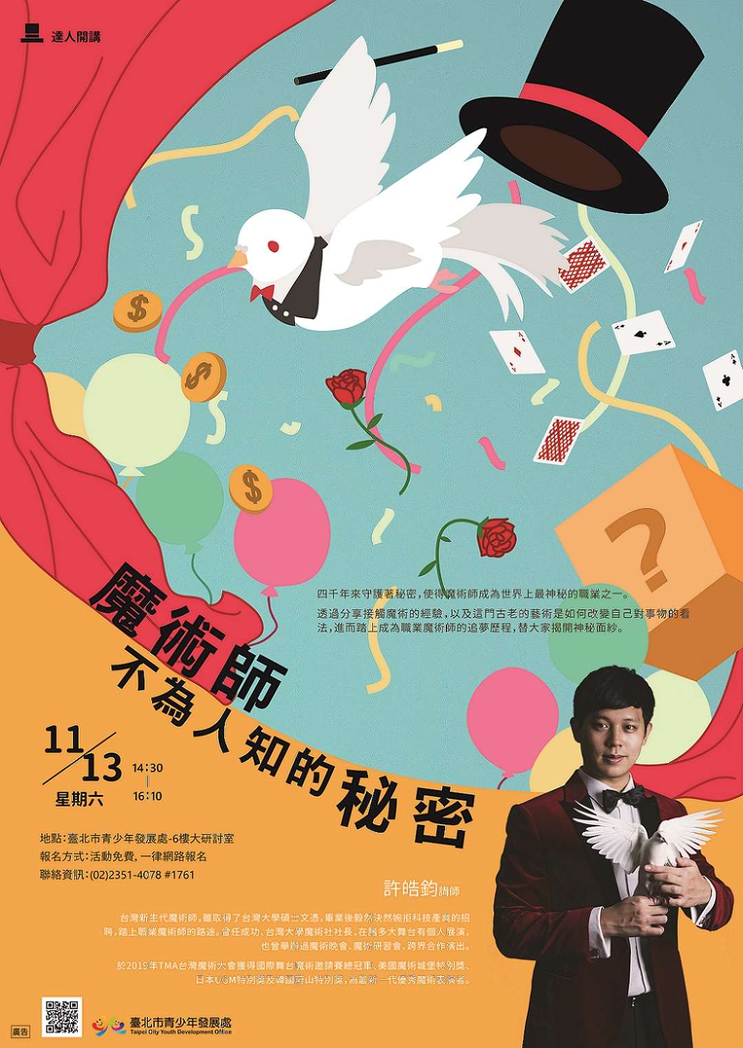 三、宣傳稿內容:臺北市青少年發展處11月13日14:30舉辦達人開講「魔術師不為人知的秘密」,許皓鈞老師與您分享魔術師的真實面貌,以及過程中的挑戰。活動免費,詳見青發處官網。