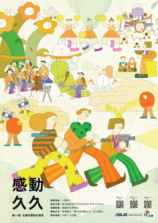 一、為培育國內新銳年輕導演及影視製作人才,本會與華碩文教基金會多年來持續共同主辦『感動久久全國校園短片徵選』。今年活動邁入第14屆,號召國內在學學生,發揮年輕學子的影像力與創意力,並希冀打造學生界影片徵件年度盛事,用影像力發揮影響力,「第14屆感動久久」活動徵選99秒~3分鐘的短片,活動獎金最高為10萬元。