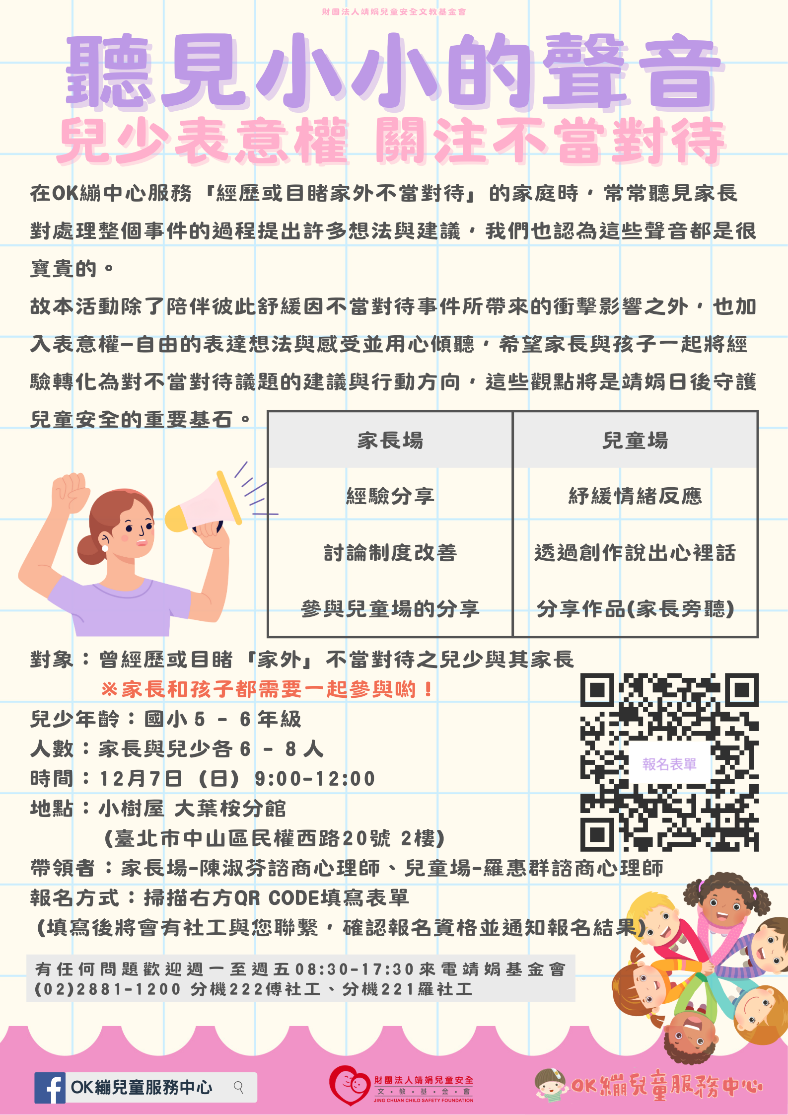 三、綜上,該會將以「家外不當對待」為活動主題,邀請曾經 歷或目睹不當對待之家長及兒少共同參與,期協助本市各 國小家長及兒少凝聚意見與想法並討論現行不當對待相關 制度可 改善之處,透過家長與兒少之聲音,將成為推動不 當對待相關議題持續進步的重要力量。