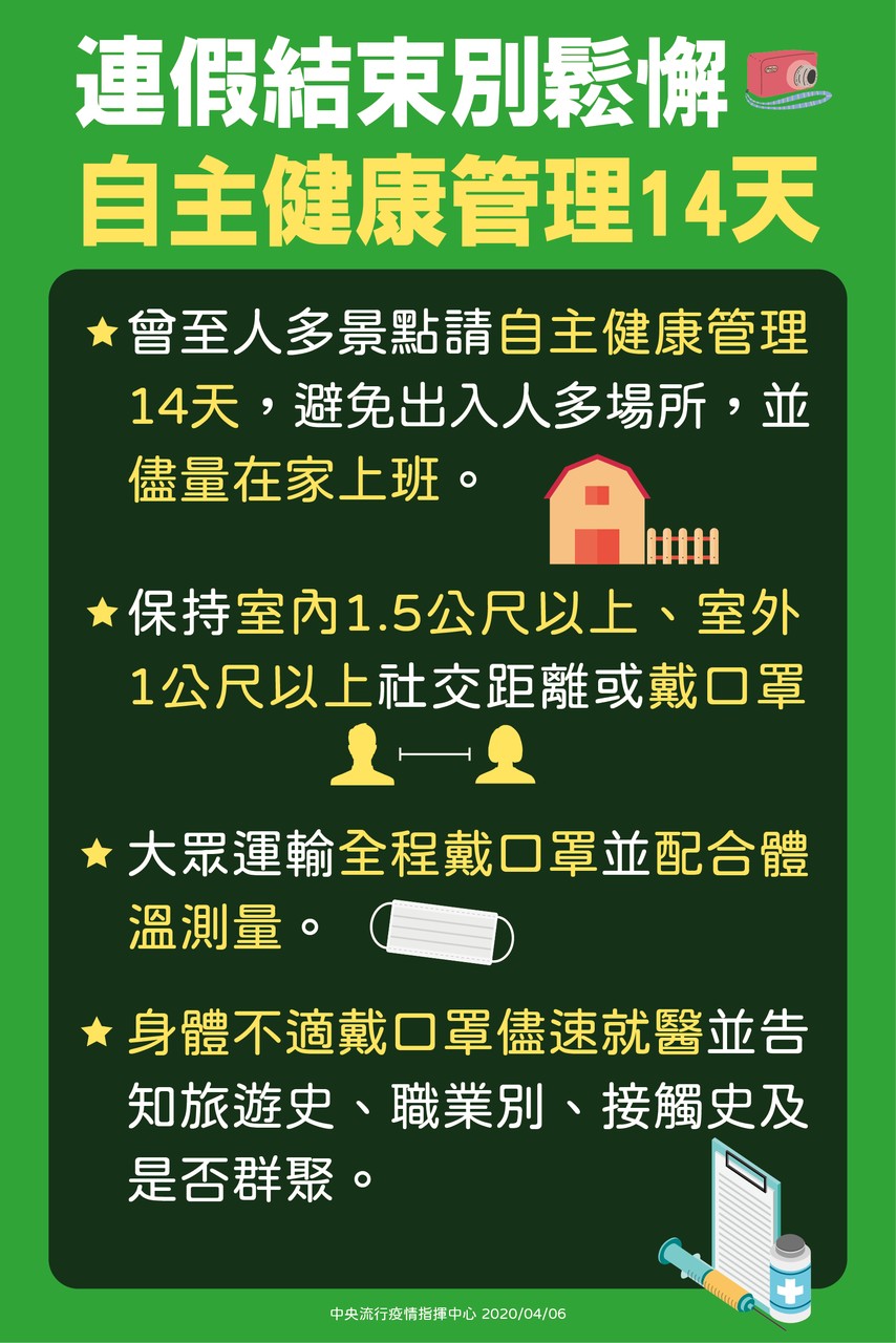 4、連假期間,若貴子女或同住家人有出入人潮密集處或與境外親友會面,務必轉知導師知悉,並隨時注意健康狀況,進行健康自主管理。
