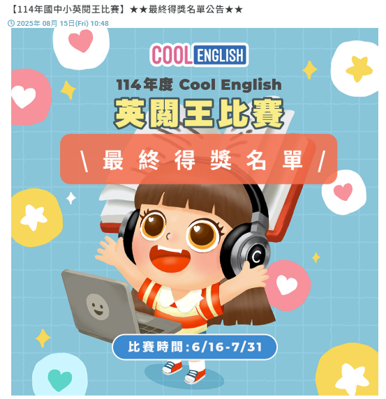 【114年國中小英閱王比賽】獲獎學生名單,感謝卓伊老師、鄭郁蓉老師、林麗華老師用心指導 !
