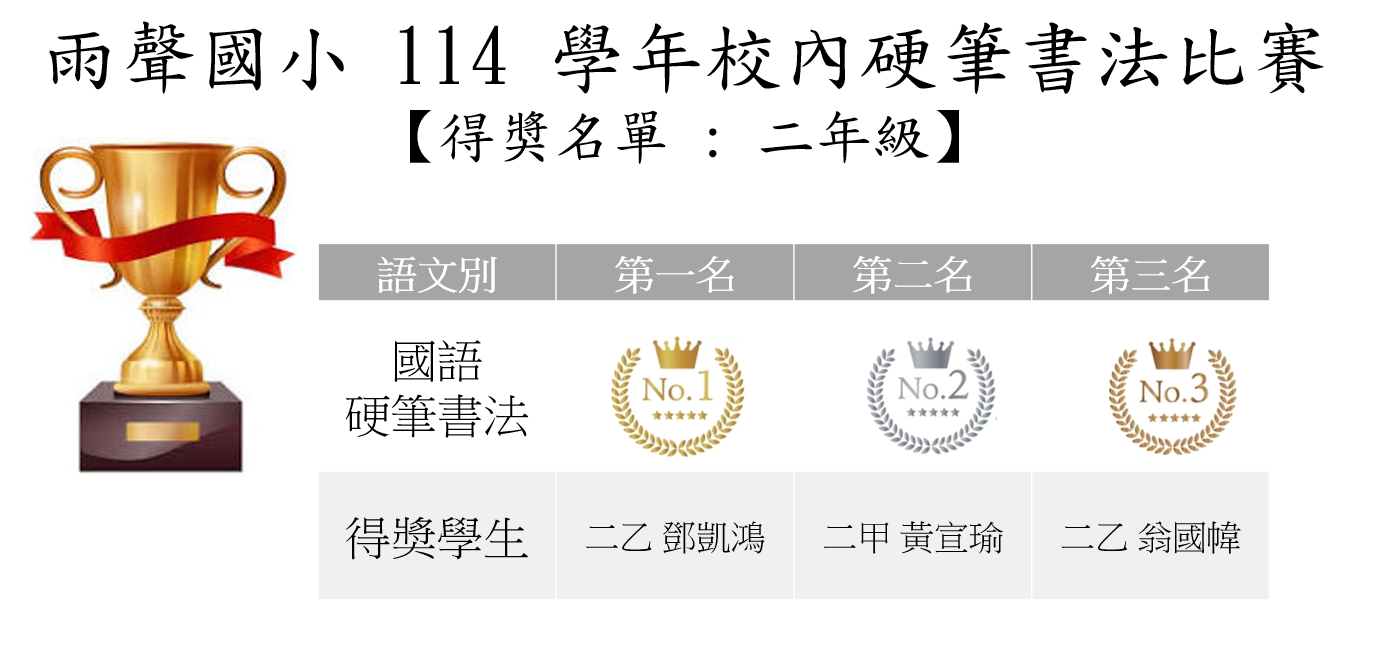 賀 ! 【雨聲國小 114 學年校內多語文競賽得奬名單 : 二年級】