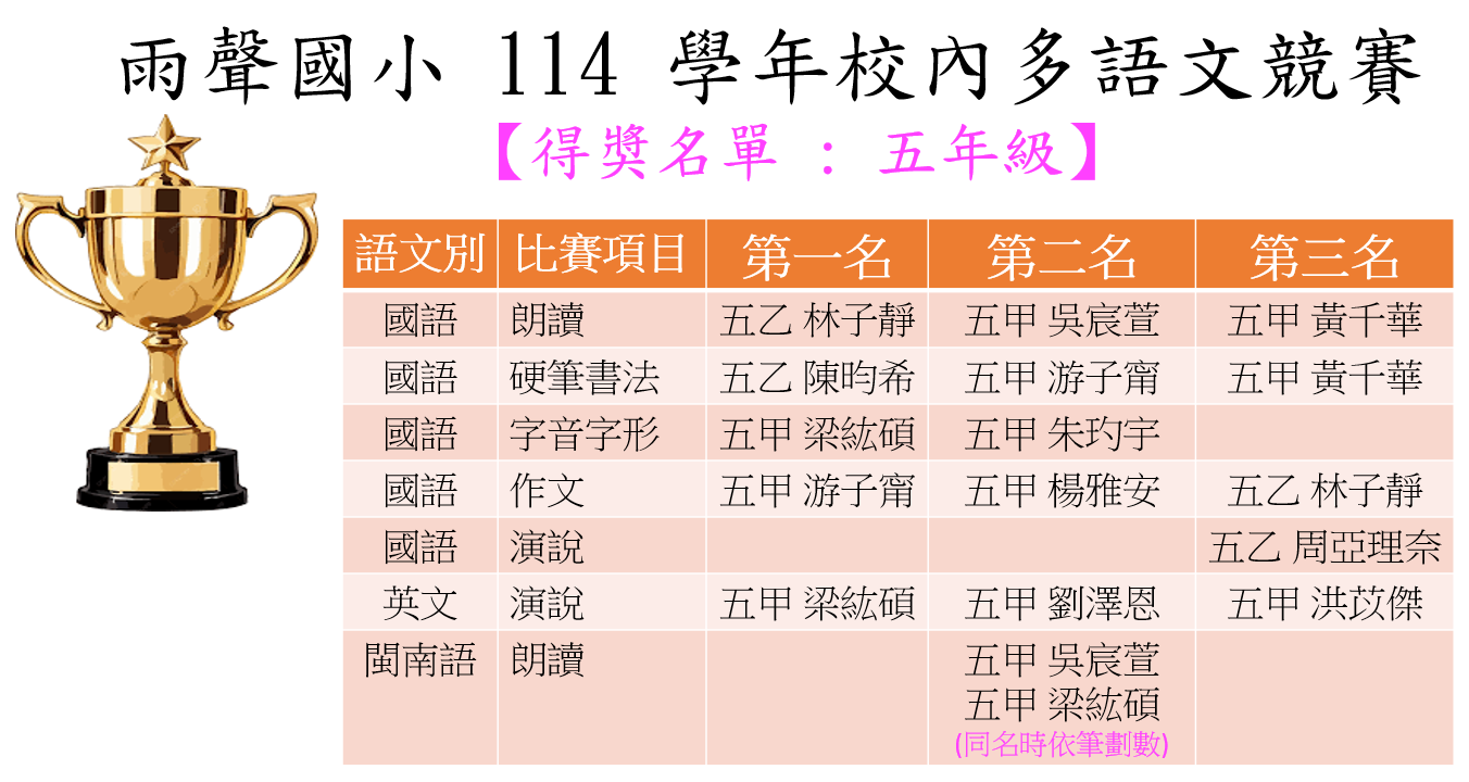 賀 ! 【雨聲國小 114 學年校內多語文競賽得奬名單 : 五年級】