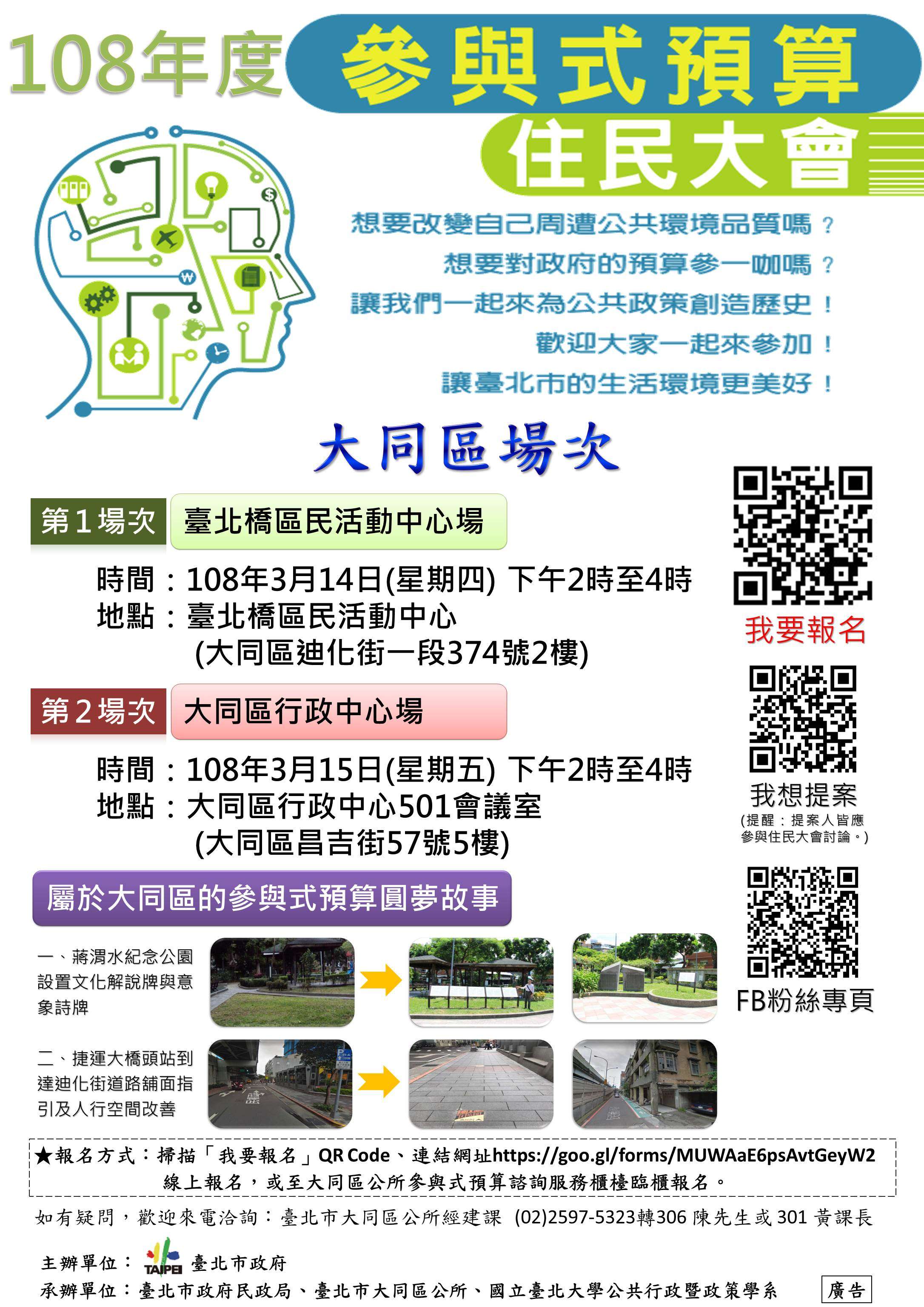 (三)參加對象:年滿18歲(走入校園計畫16歲)以上且設籍、就學(業)或居住地在「大同區」的市民朋友。.