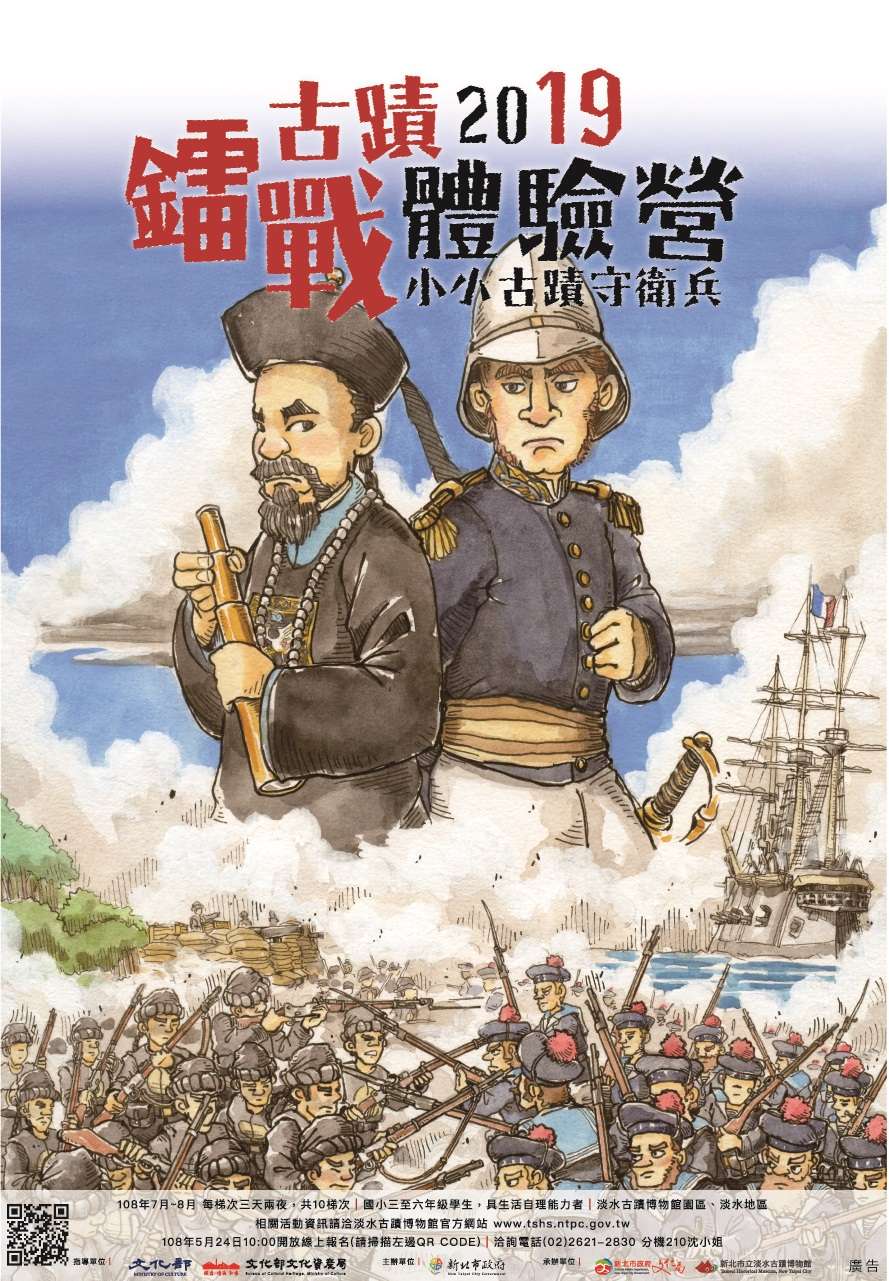 一、本館2019年「小小古蹟守衛兵-古蹟鐳戰體驗營」特別以1884年發生在淡水的「清法戰爭-滬尾之役」為主軸,推出走踏古戰場、探尋重要古蹟-「滬尾礮臺」的主題式冒險體驗營。讓孩子們化身小小古蹟守衛兵,透過精采刺激的鐳戰、古戰場尋寶等特色活動,以身體活動與豐富的想像力,重新認識古蹟,遊遍淡水古戰場,深入了解淡水的古老故事。