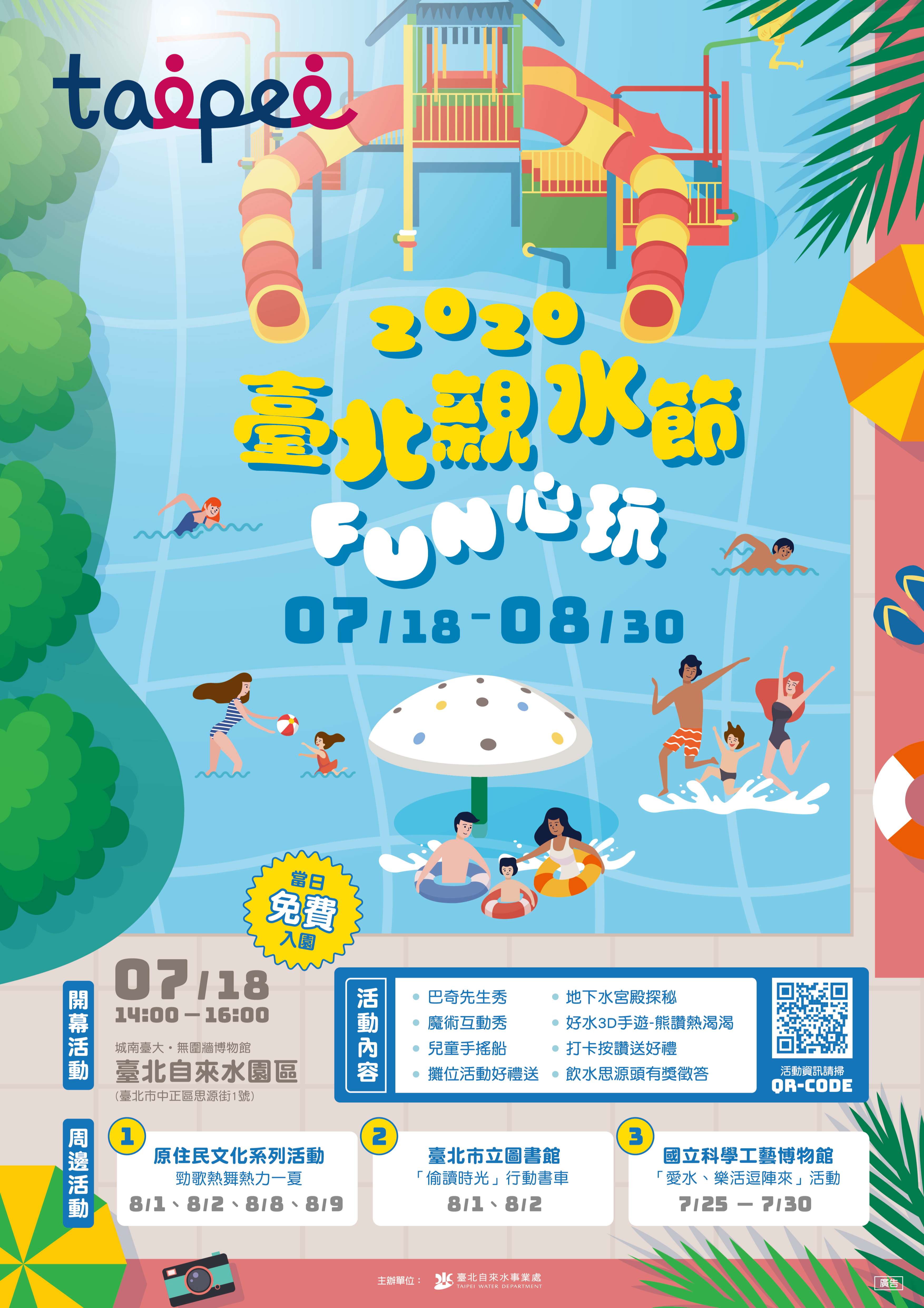 2020臺北親水節自109年7月18日至109年8月30日,邀請您FUN心玩水,清涼一夏,參與熱力十足原民活動,詳情請上「自來水園區」官方網站或FB粉絲團查詢,或洽02-83695104,自來水園區歡迎您的到來。