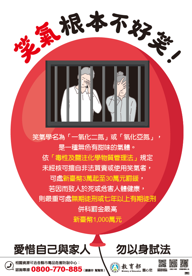 說明: 一、依教育部110年10月15日臺教學(五)字第1100139822號函辦理。 二、笑氣學名為「一氧化二氮」或「氧化亞氮」,是一種無色有甜味的氣體,行政院環境保護署於109年10月30日列為「關注化學物質」。