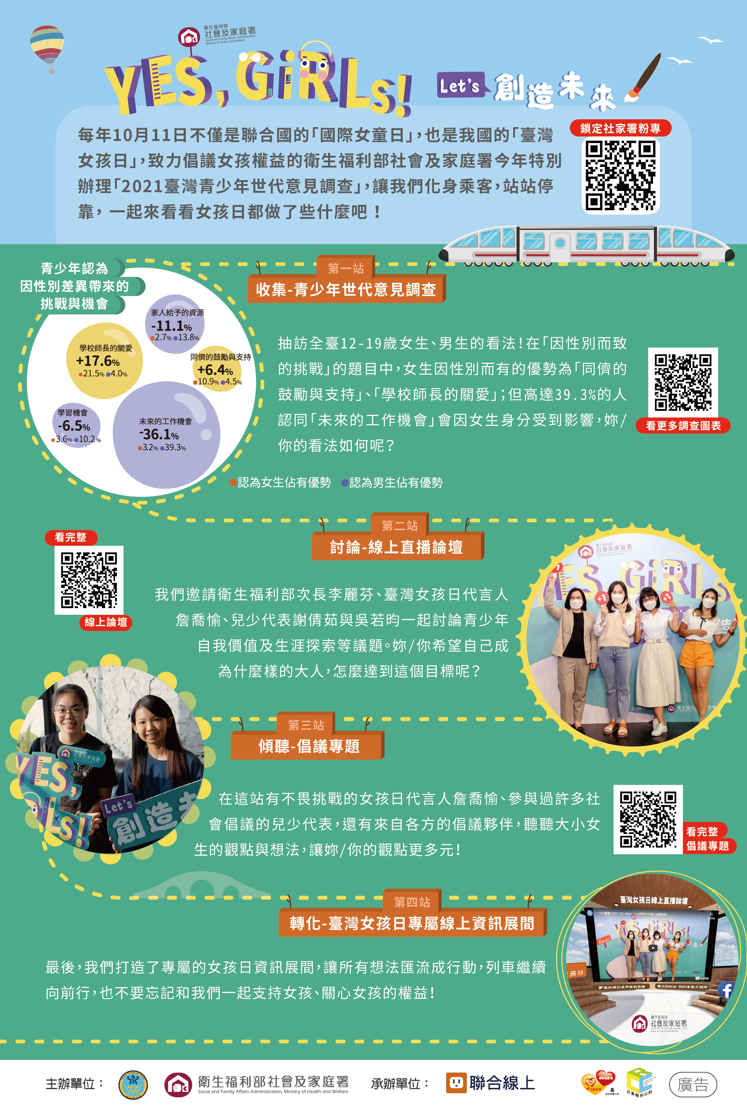 說明:每年10月11日是聯合國的「國際女童日」,也是我國的「臺灣女孩日」,為宣導臺灣女孩日之理念及精神,衛生福利部社會及家庭署規劃辦理旨揭活動,並集結本年度活動成果,包含「收集-青少年世代意見調查」、「討論-線上直播論壇」、「傾聽-倡議專題」、「轉化-臺灣女孩日專屬線上資訊展間」,鼓勵教師引導學生共同關切女孩權益,構築支持女孩多元發展及積極參與社會決策的友善環境。