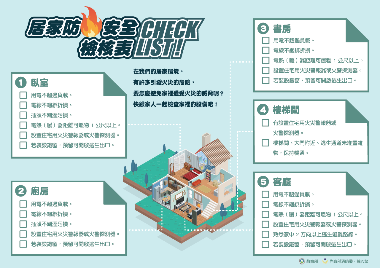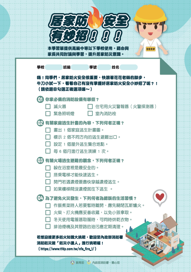 二、近年火災頻傳,造成民眾財產損失與人命傷亡,為加強宣導防火與防災觀念,喚起校園師生之居家防火安全意識,請善加運用旨揭學習單與檢核表,以提升防火知識與火災緊急應變能力。
