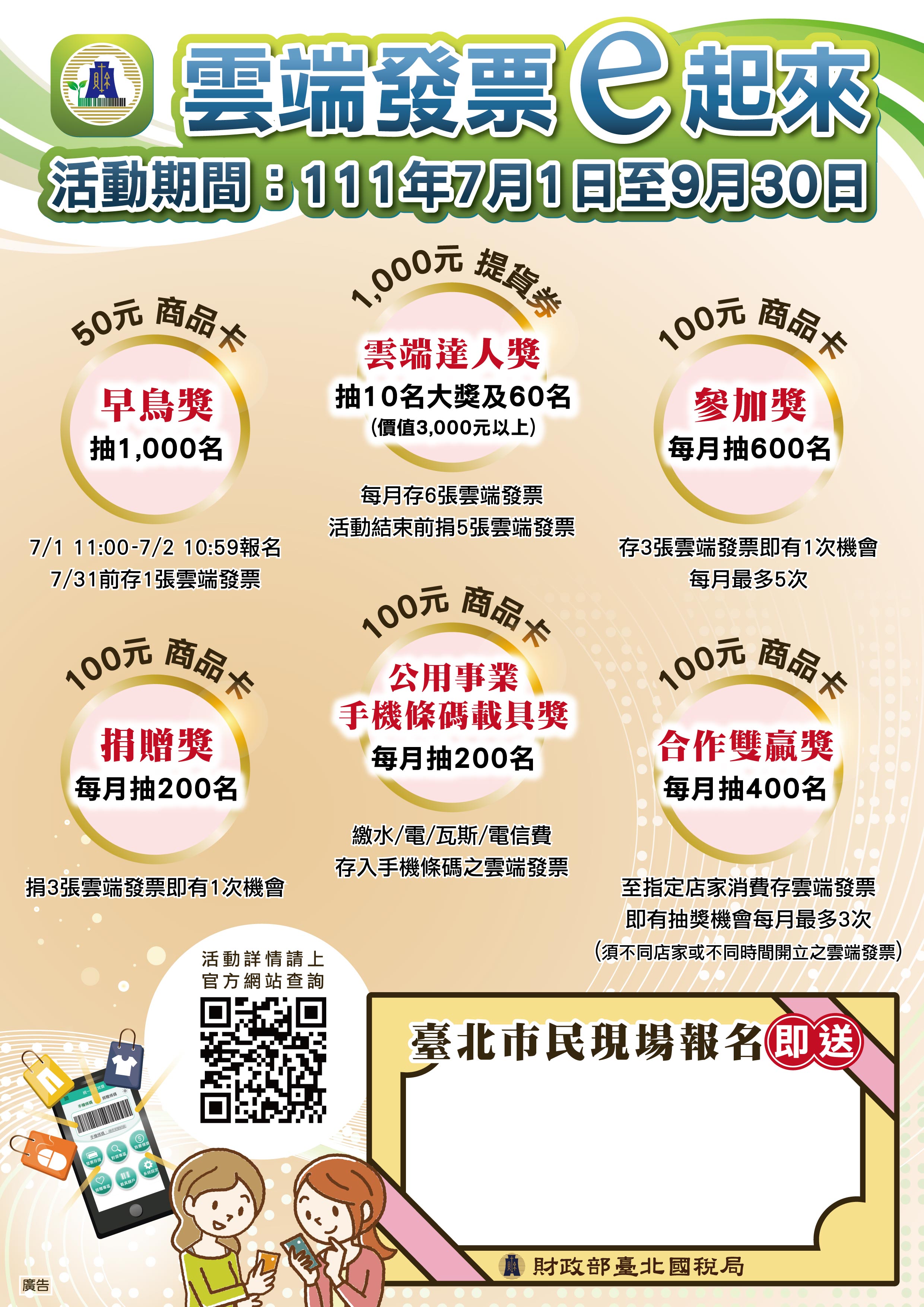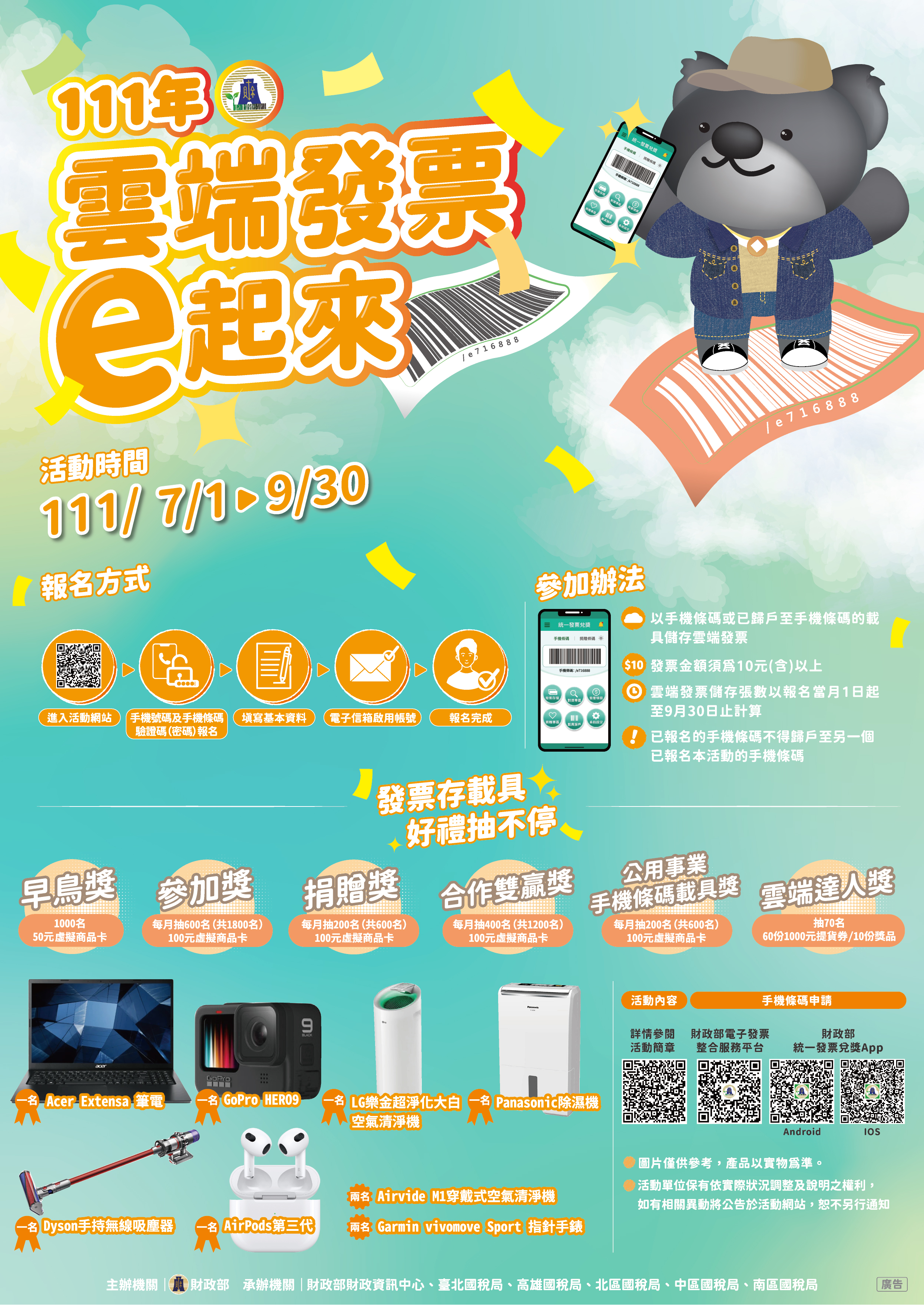 說明:「雲端發票E起來」,活動期間 111年7月1日至111年9月30日,歡迎報名參加。