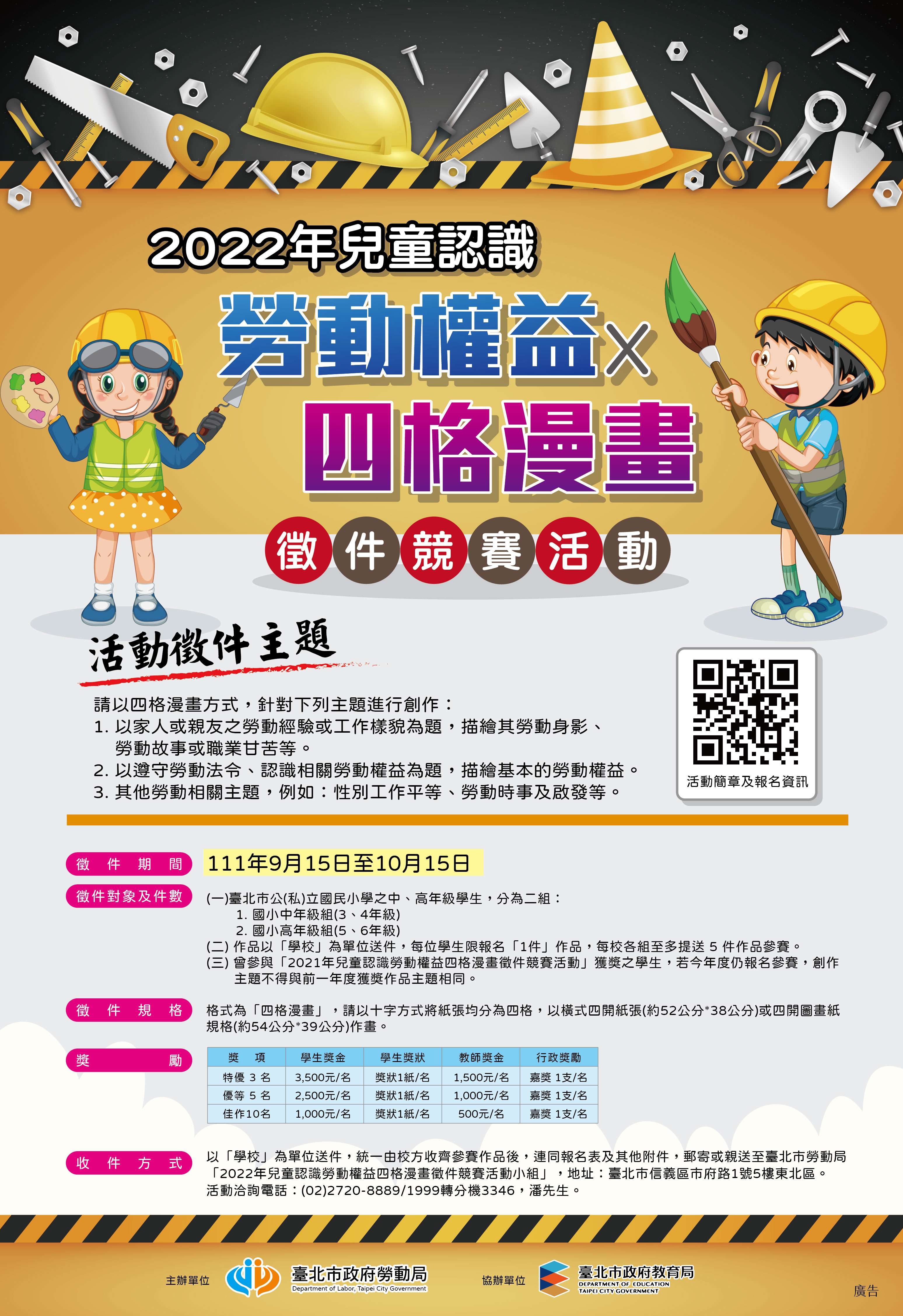 一、為推廣校園勞動教育再向下扎根,以本市國民小學中、高年級學生為對象,辦理「2022年兒童認識勞動權益四格漫畫徵件競賽活動」,期藉由競賽式活動設計,鼓勵教師將勞動教育融入繪畫教學,並指導學生參加四格漫畫創作,進而啟發學生對勞動尊嚴及職場環境之認知與關心,以提升未來公民勞動素養。