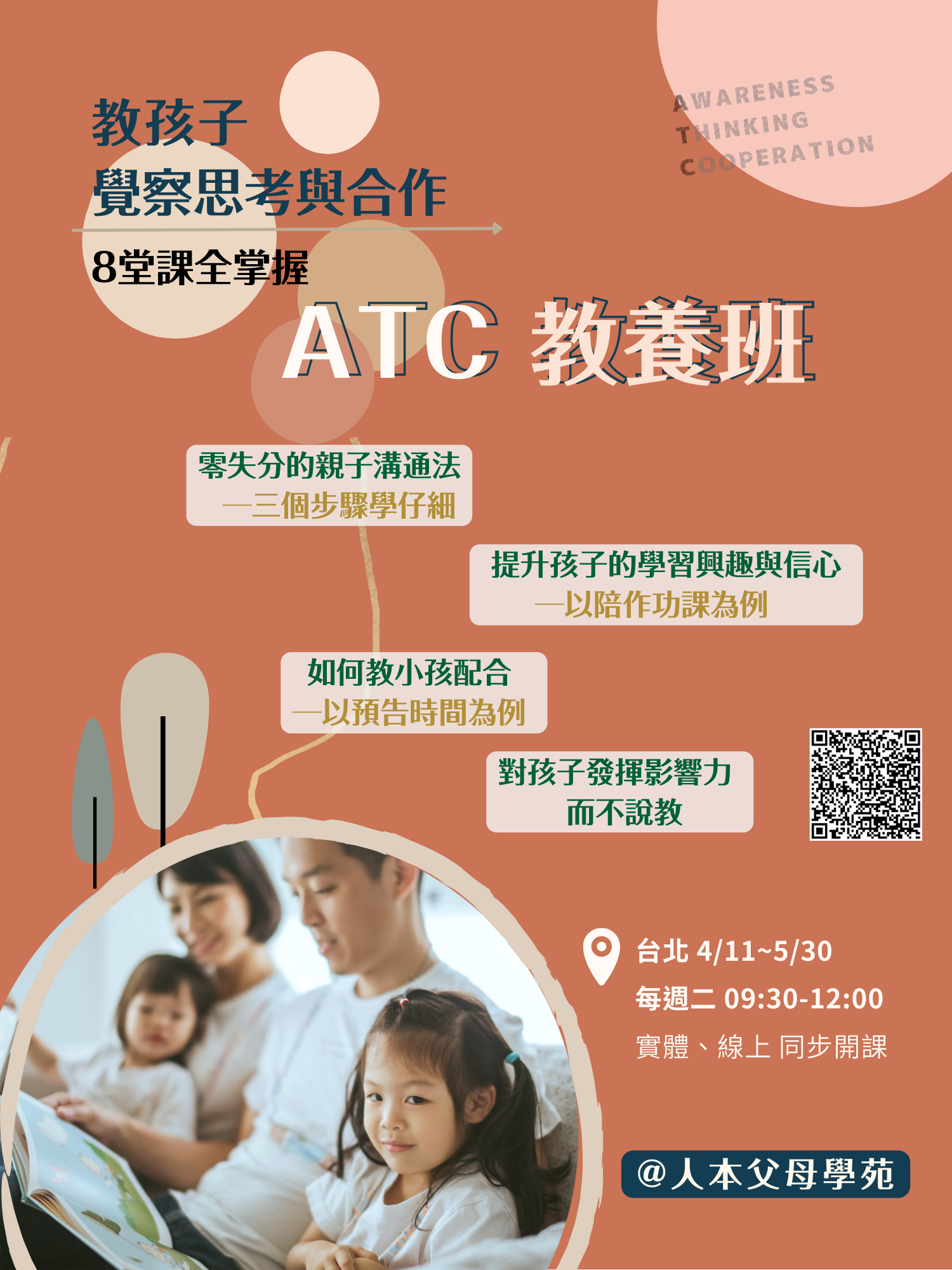 112年4月11日至5月30日,舉辦「人本父母學 苑-ATC教養班」課程,包含四個講題: