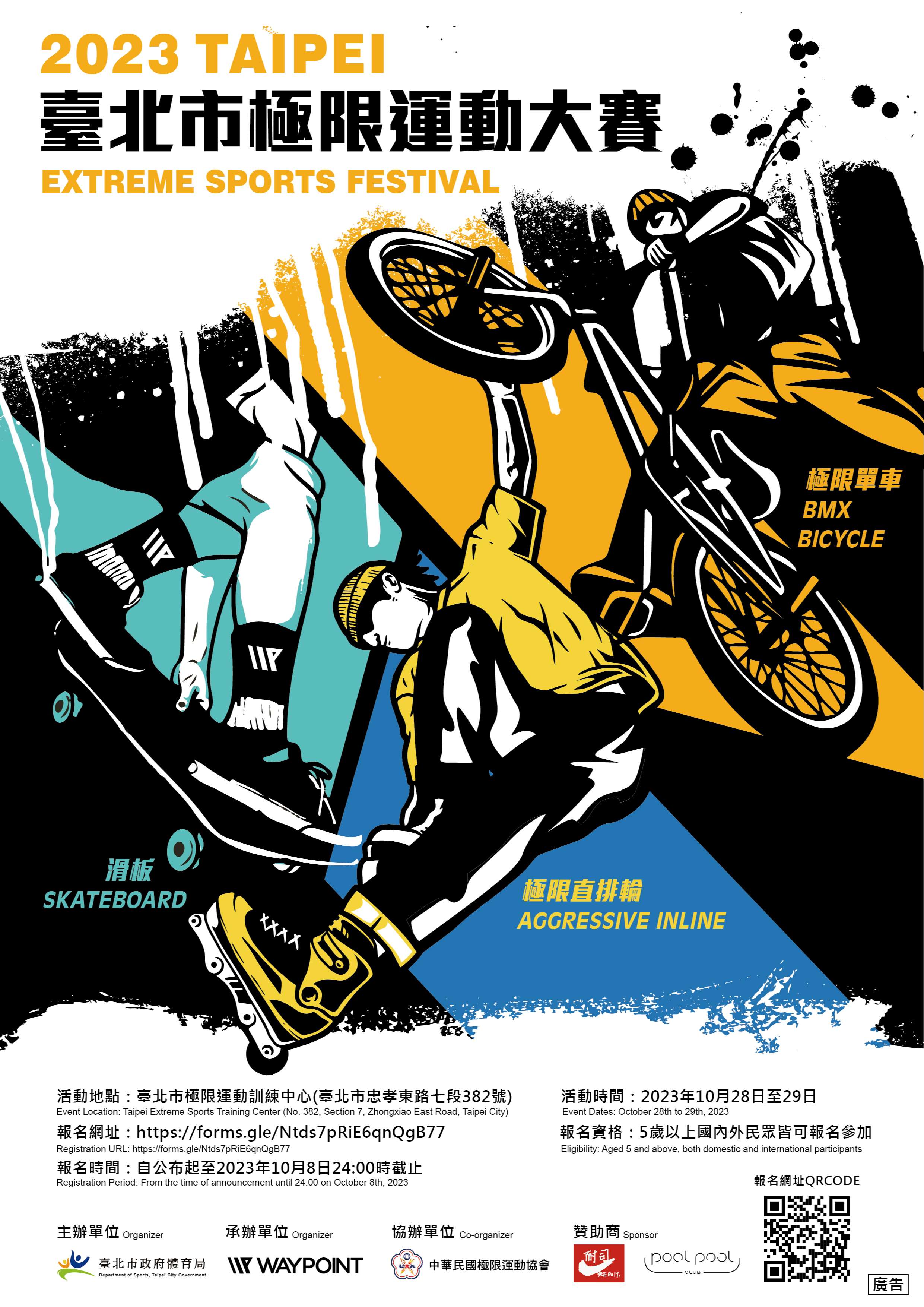 2、30字:2023年臺北市極限運動大賽10/28-29舉行,9 /11開放報名,活動資訊詳見官網。