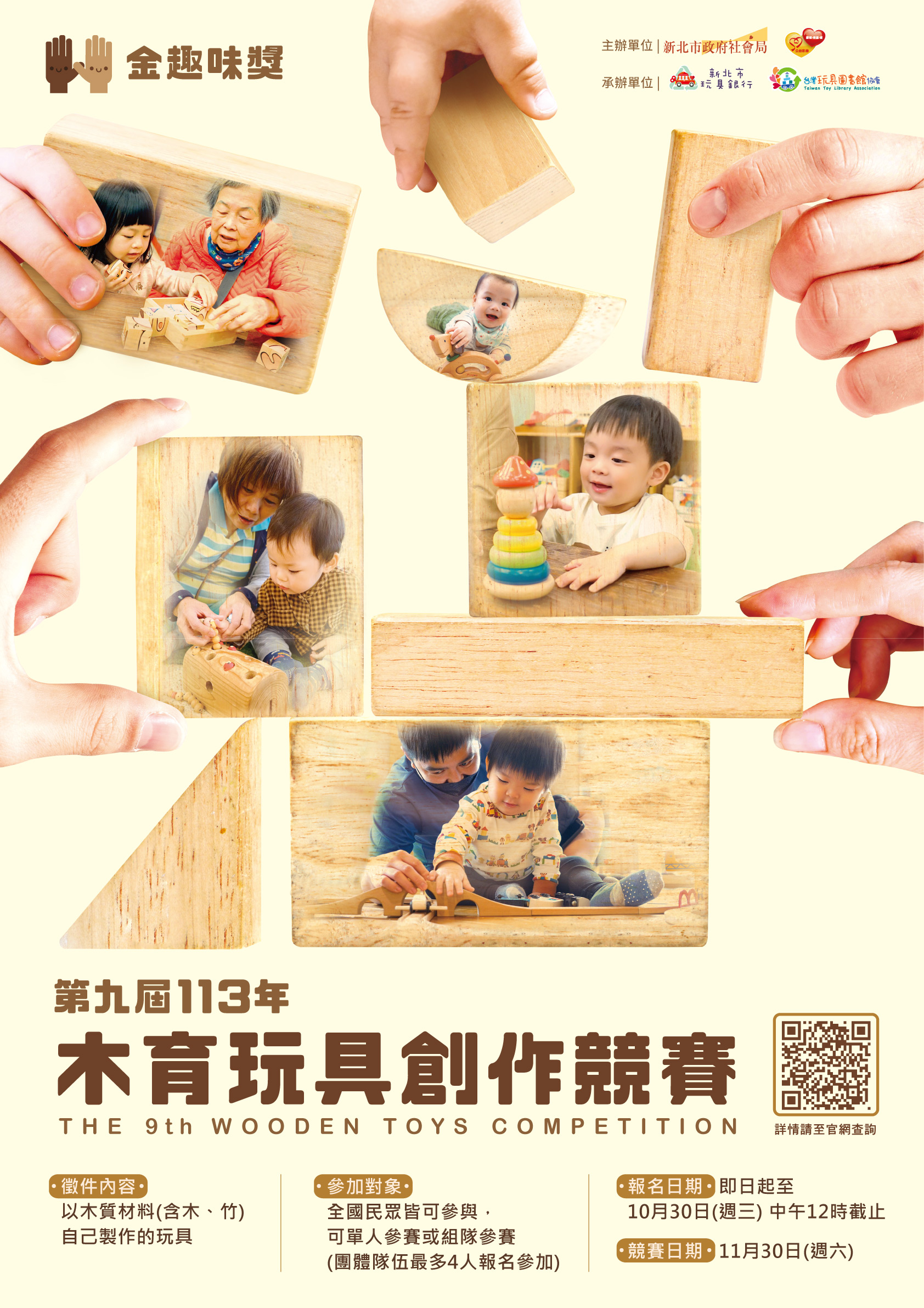 一、本會與新北市政府社會局合作辦理《113木育玩具創作競賽-第九屆金趣咪獎》,誠摯邀請貴校師生參與競賽活動。
