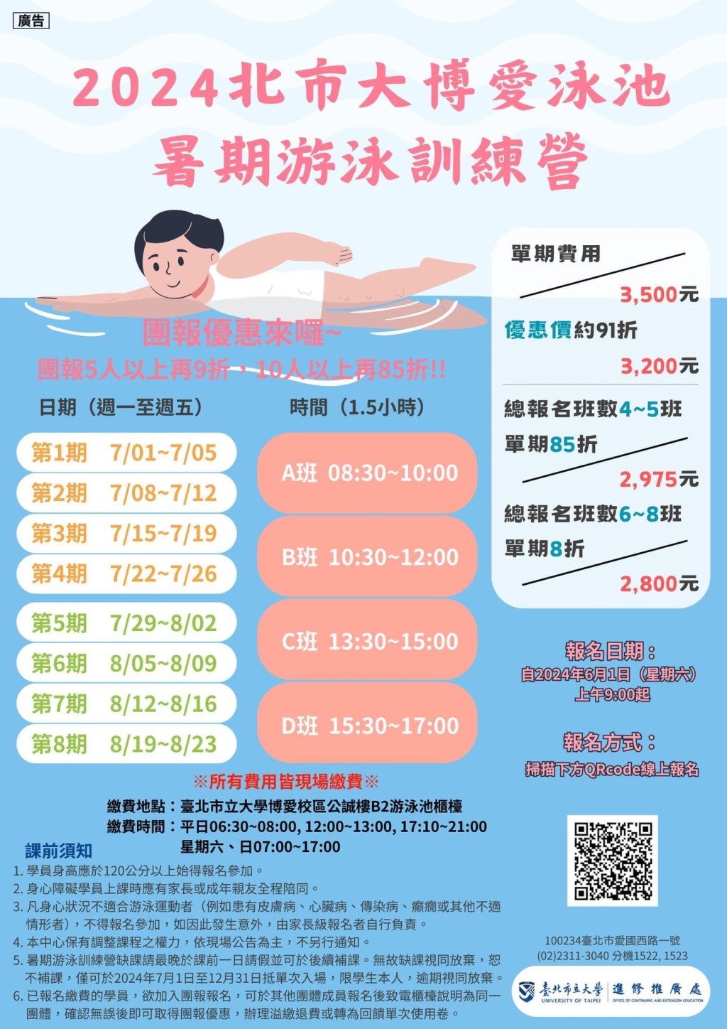二、本校博愛校區泳池環境優良、設備完善、師資專業,請惠予轉知校內同學及家長,歡迎前來報名參加泳訓班。線上報名頁面連結:https://cee.utaipei.edu.tw/course/164 。
