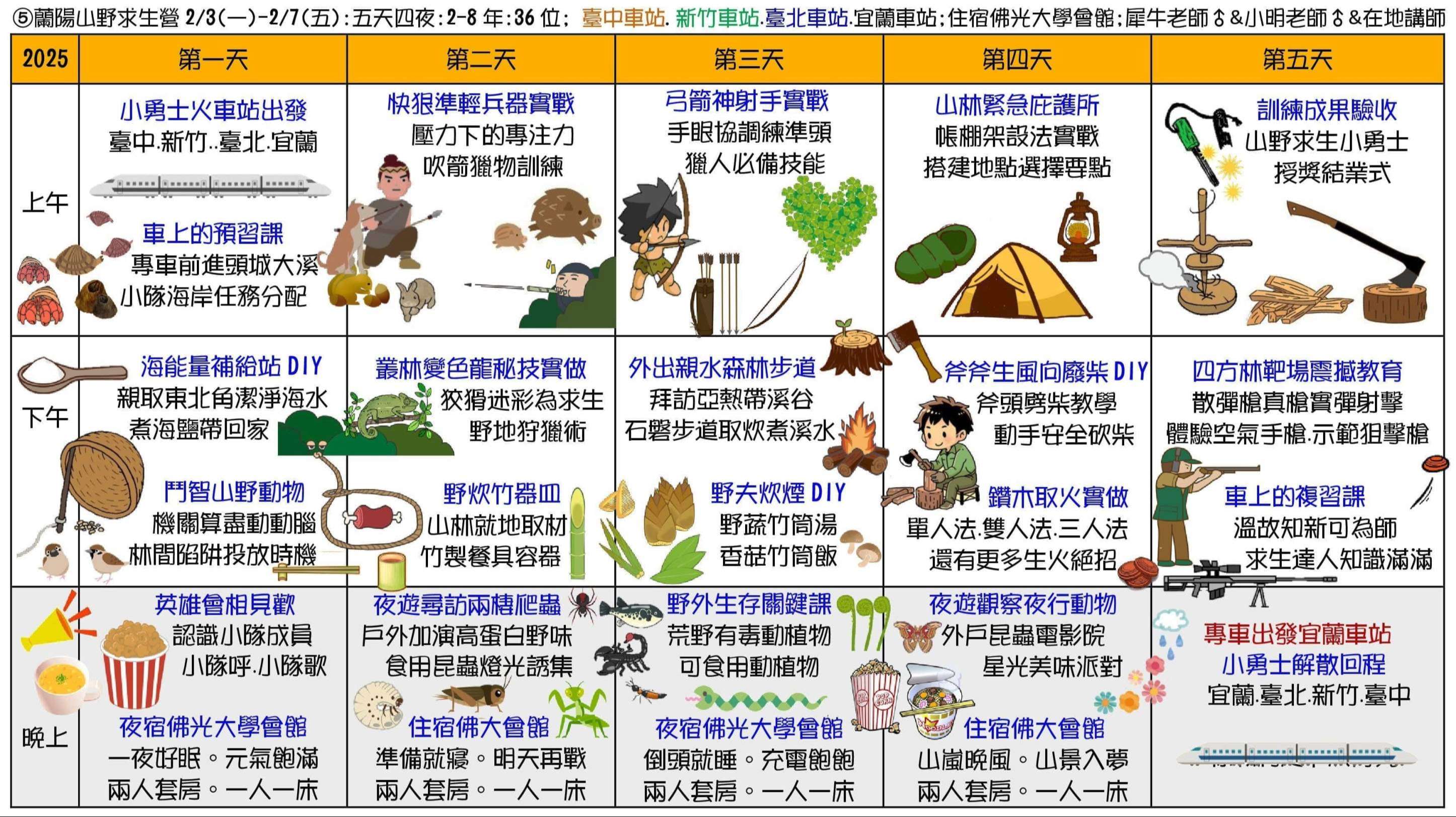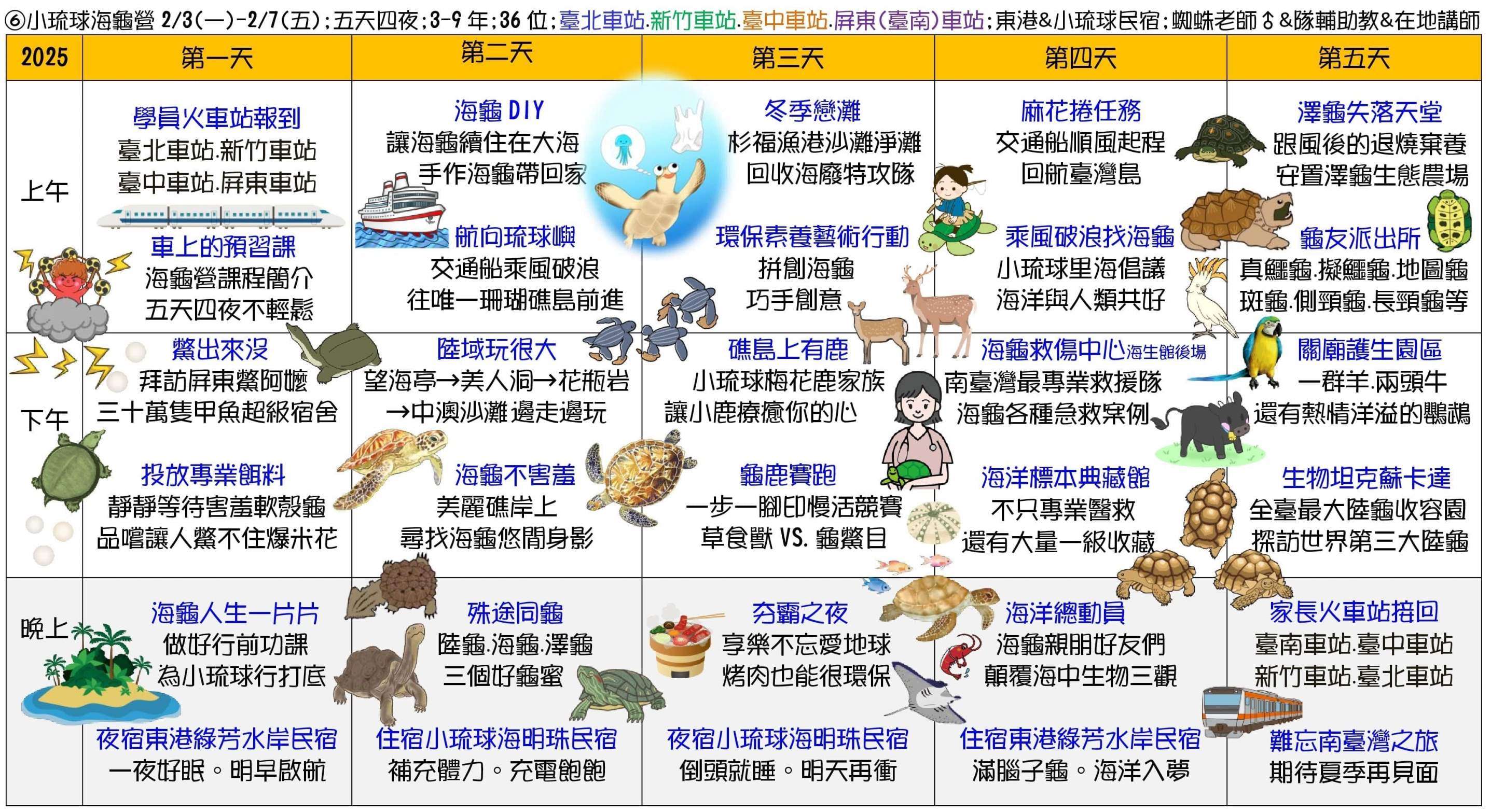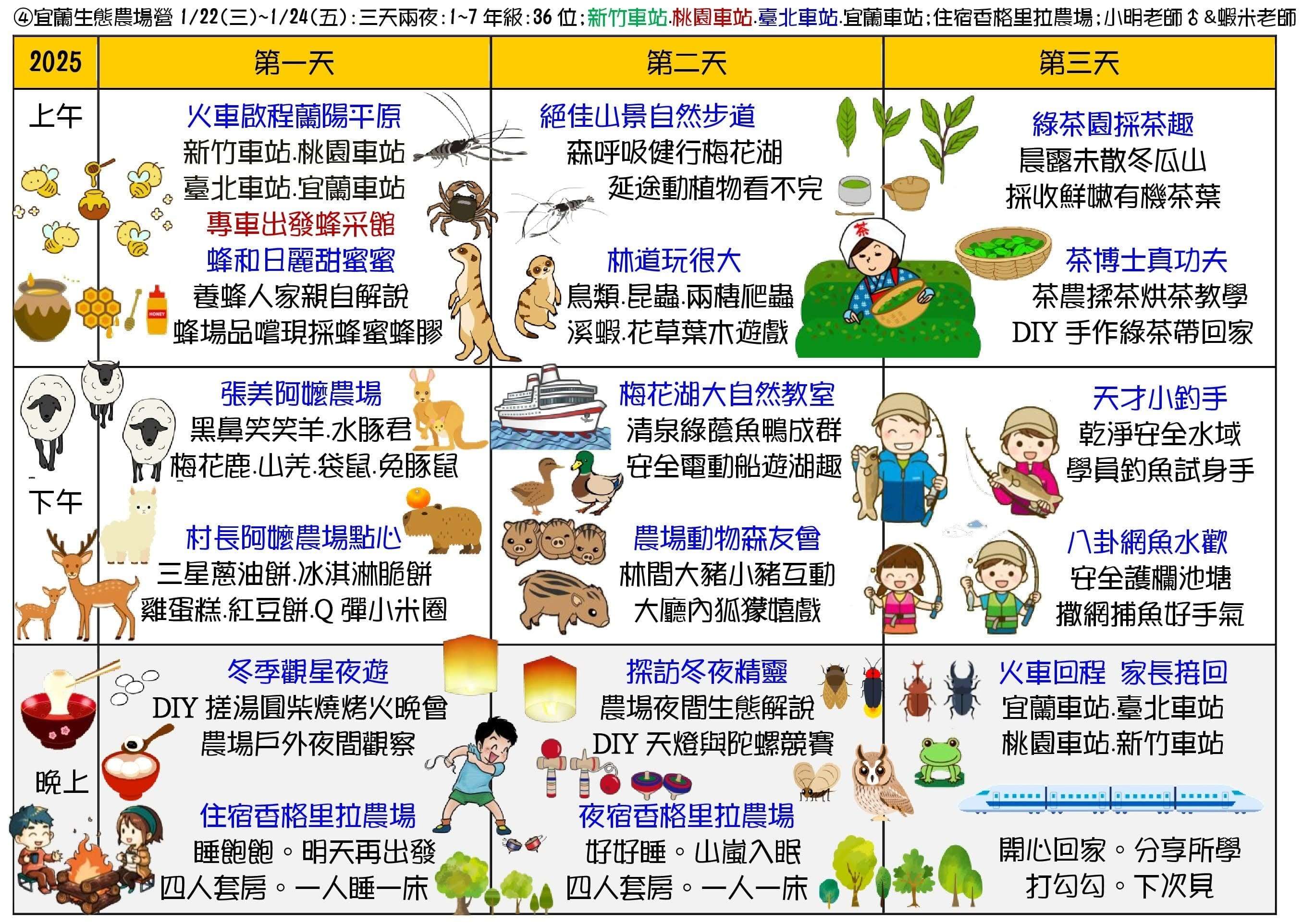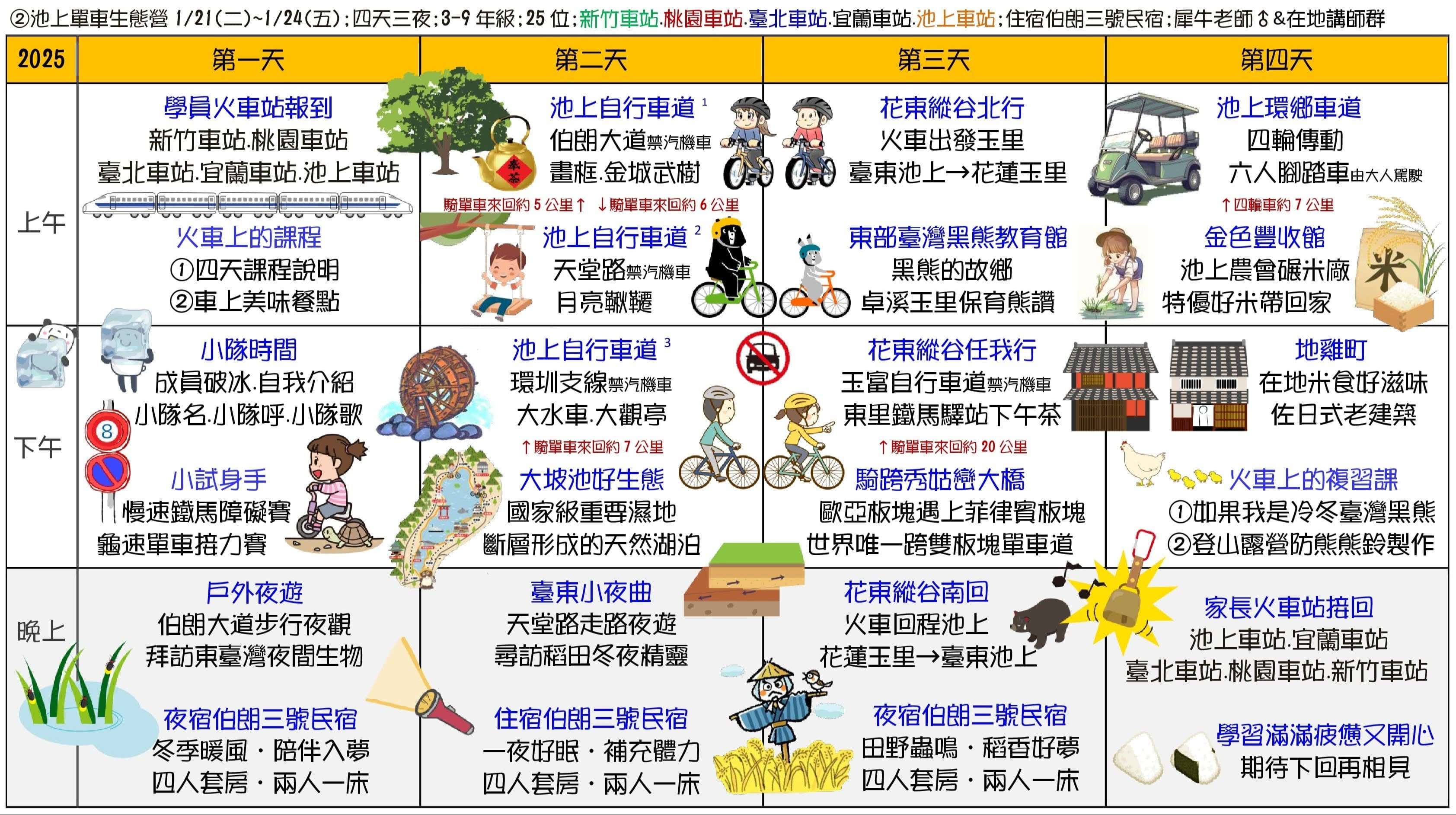 二、冬令營課程主題為:①甲蟲營(2天)、②池上單車生態營(4天3夜)、③節肢小怪獸營(4天3夜)、④宜蘭生態農場營(3天2夜)、⑤蘭陽山野求生營(5天4夜)、⑥小琉球海龜營(5天4夜)。