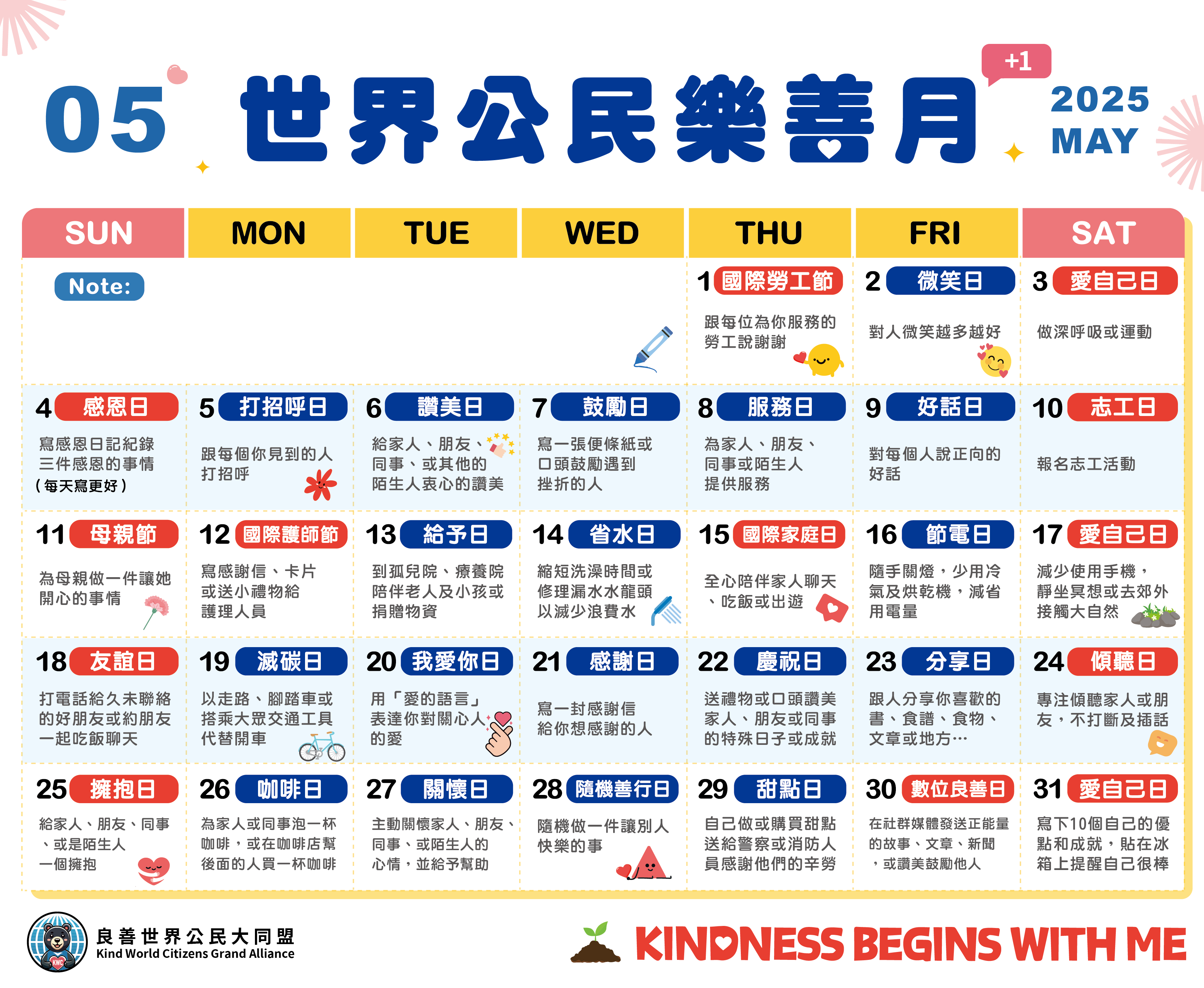 三、另ESGWD基金會設計「世界公民樂善月月曆」(附件3)及樂善月任務單(附件4),於本(114)年度5月安排多項品德教育相關活動,希望協助學生於生活中實踐品德教育行動,培養良善之美德,各校可自由運用於校內品德教育推廣活動。