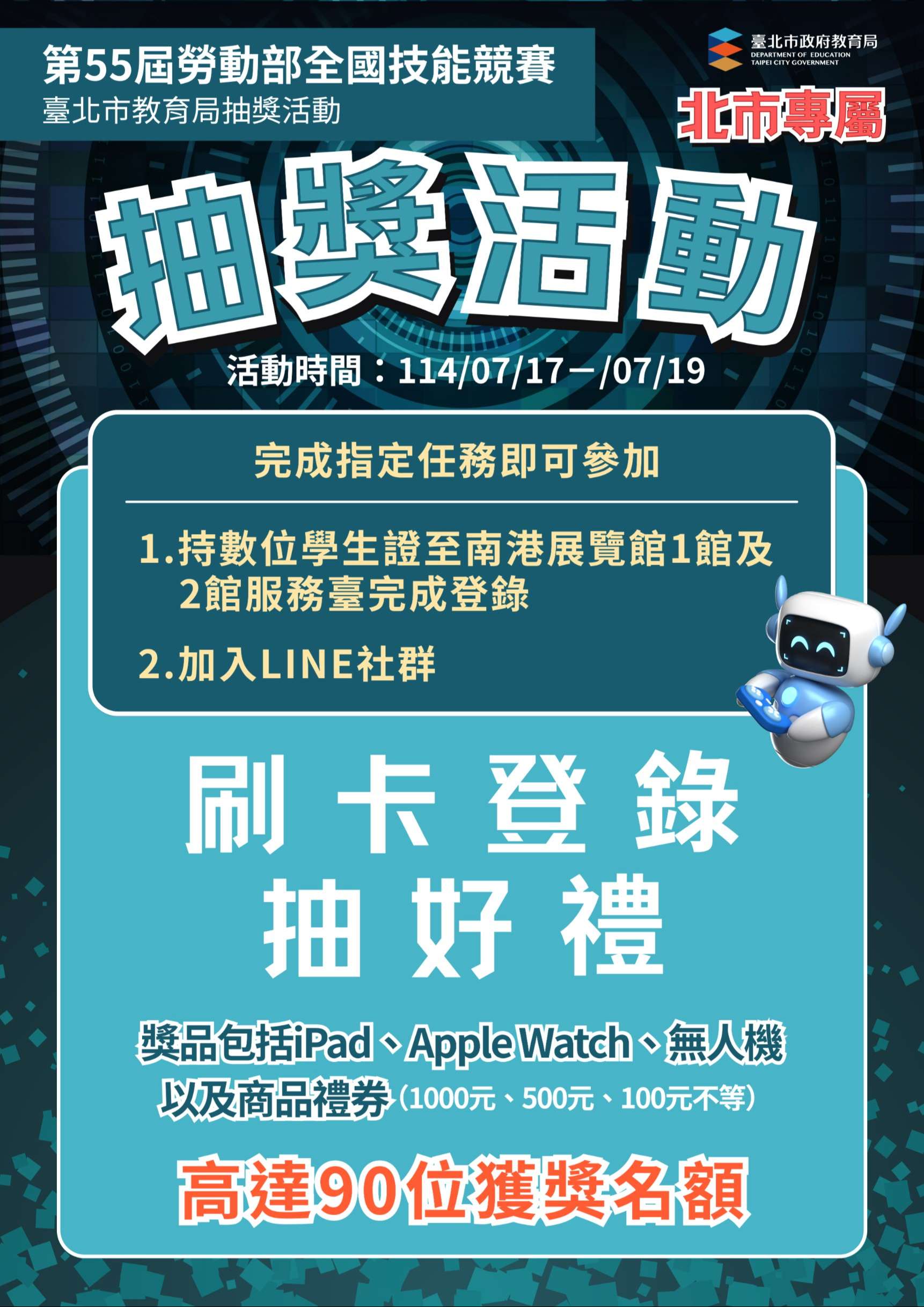 四、現場提供本市學生限定好禮抽獎活動,凡本市各級學校學 生持數位學生證至南港展覽館1館及2館,至大會服務臺完 成登錄即可參加抽獎,獎品包括平板電腦、智慧手錶、無 人機、以及商品禮券(1000元、500元、100元不等),高 達90位獲獎名額。